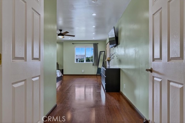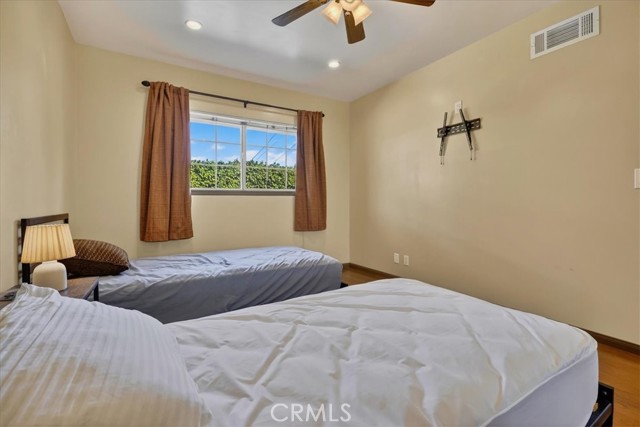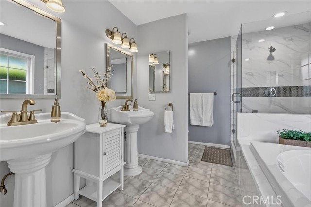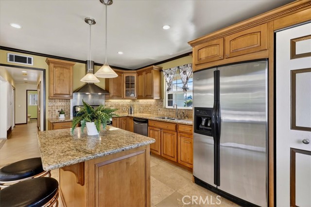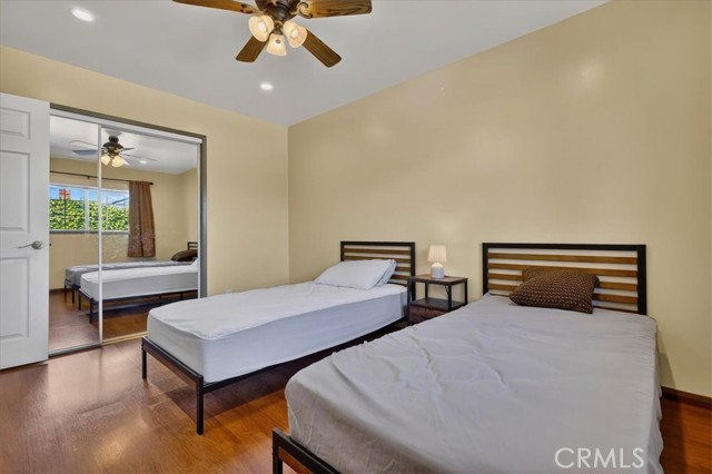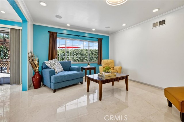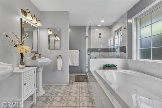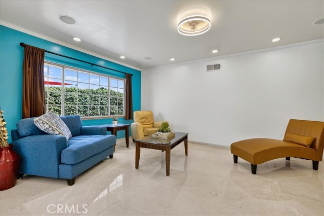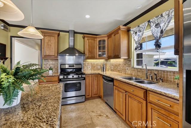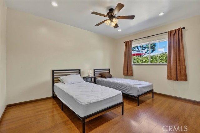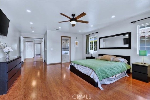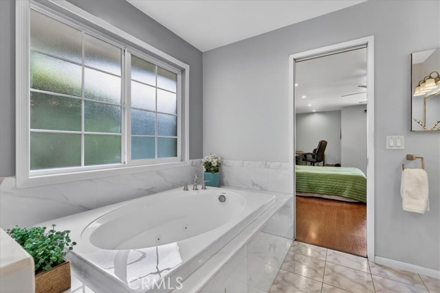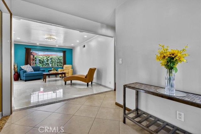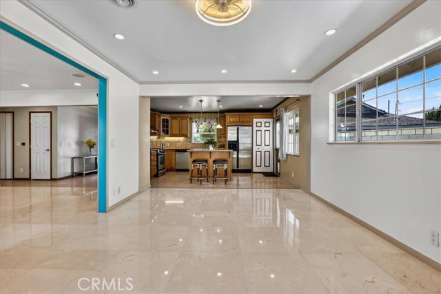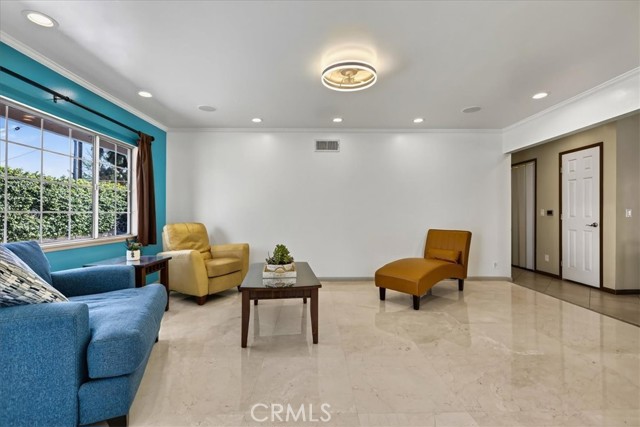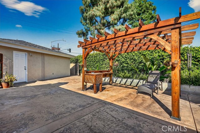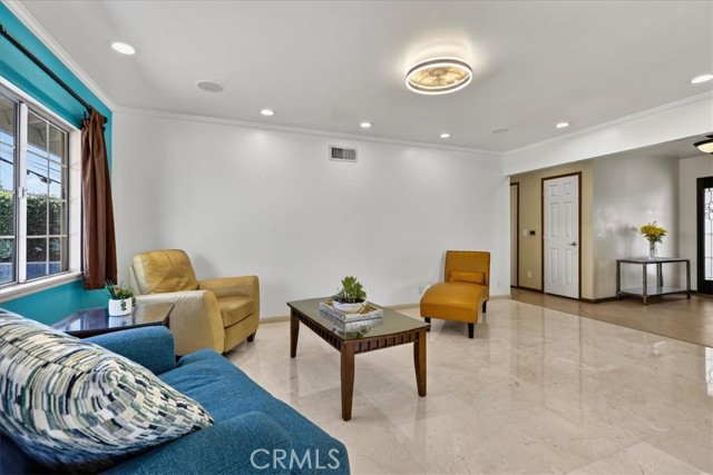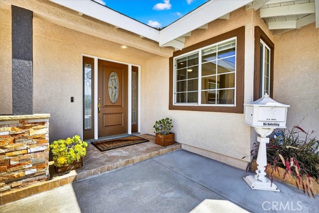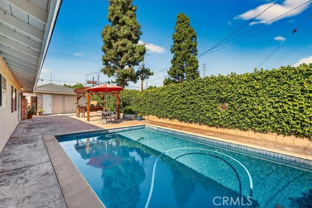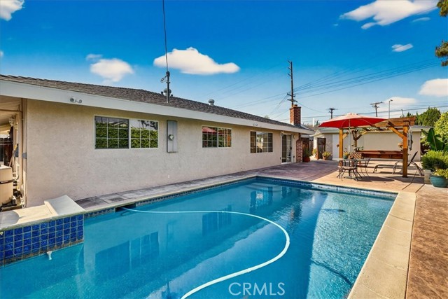 Beautiful home on a quiet cul-de-sac in the highly desirable Green Hills neighborhood, this home welcomes you with low-maintenance landscaping, plentiful driveway parking, and the convenience of an electric vehicle charger powered by an upgraded 200-amp electrical service. A gated driveway also offers secure RV parking. Step inside to discover an open-concept layout where the living room, kitchen, and family room flow together seamlessly. Polished marble flooring flows throughout the living room, where surround sound speakers are discreetly built into the ceiling. The spacious kitchen features granite countertops, a large island with a microwave oven and a built-in beverage refrigerator. The expansive family room is centered around a fireplace accented by a stunning porcelain tile wall. The primary suite is a true retreat, offering ample room for a home office area, a generous walk-in closet with built-in shelving and drawers, and a spa-like ensuite bathroom complete with a Jacuzzi tub, dual pedestal sinks, and a spacious shower. All additional bedrooms feature ceiling fans and LED recessed lighting, and every bathroom has been thoughtfully upgraded. Step outside to your private backyard oasis. Accessed through the family room, the space features a charming pergola, low maintenance landscaping, and a sparkling swimming pool heated by solar. Additional highlights include a two-car detached garage with abundant overhead storage and cabinetry, plus a gated storage area behind the garage with two metal sheds for even more space. Thoughtful upgrades include freshly painted exterior, LED recessed lighting throughout, copper plumbing upgrades, dimmable light switches throughout, and a smart touchscreen thermostat. The property is located very close to award winning schools, many parks, large shopping center with a gym and movie theater, La Mirada Golf Course, Splash, La Mirada Theater For The Performing Arts and it is also steps away from Biola University! This home isn't just beautiful, it's perfectly positioned. With everything you need in a great neighborhood!