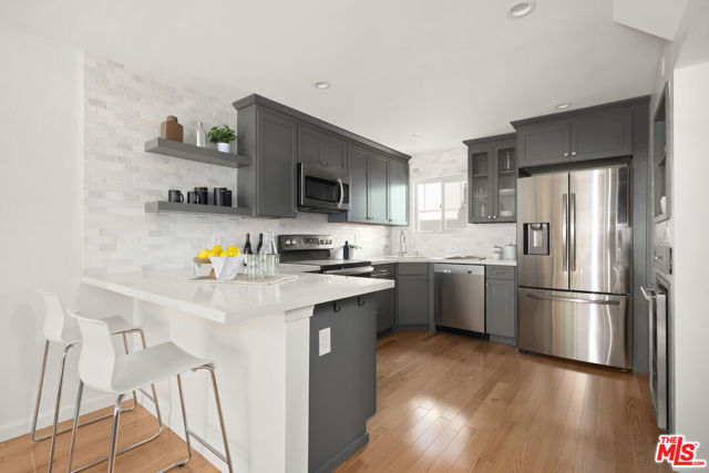 At 11954 Goshen Avenue, in a discreet pocket of Brentwood, both walkable and quiet, this tri-level 1-bedroom plus office/guest loft, 2-bath townhome offers two private outdoor spaces, soaring ceilings, and an oversized primary suite. Spanning 1,020 square feet, the residence unfolds in a fluid plan with hardwood floors throughout, lending warmth and continuity to the interiors. The living room, anchored by a floor-to-ceiling fireplace that suggests evenings of low light and long conversation, has the space to entertain and opens to a private balcony to enjoy evening drinks and morning coffees. The fully updated kitchen offers stainless steel appliances, quartz countertops, and a wine fridge. The bathrooms are clean and modern; crisp lines, thoughtful finishes, and a sense of utility refined rather than merely functional. A second loft-style room has been used as both a guest bedroom and office. Every detail serves a purpose. Air conditioning units on every level offer year-round comfort. An in-unit washer and dryer, multiple large storage spaces, and two covered parking spots with guest parking provide the ultimate convenience. What distinguishes this Goshen Avenue home is not extravagance but balance: comfort without excess, sophistication without display, and close proximity to grocery stores, restaurants, gyms, and more. It is a residence attuned to the rhythms of Los Angeles living, a private retreat in the heart of the city. OFFER DEADLINE: TUESDAY 3/31 @ 12:00 PM
