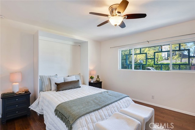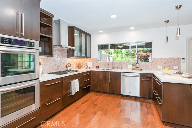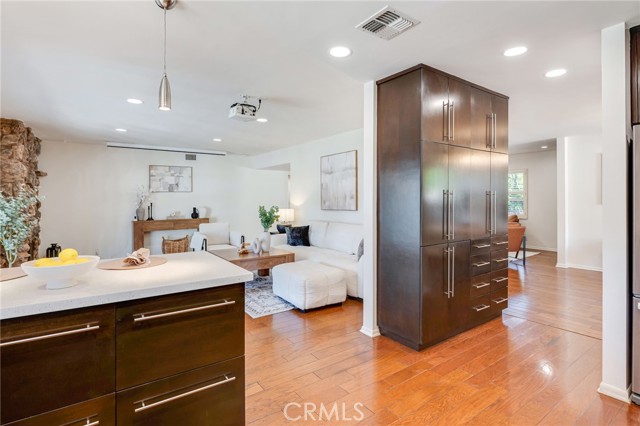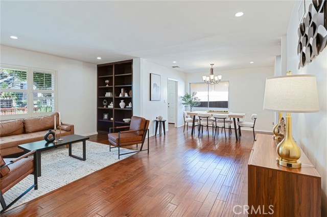 Located in the sought-after Chandler Estates neighborhood, this thoughtfully reconfigured residence blends modern flow with classic Mid-Century character. From the moment you arrive, the home impresses with inviting curb appeal, featuring a beautifully landscaped drought-tolerant native garden, a charming stone-lined walkway, and striking architectural accents. At the heart of the home is a beautifully updated gourmet kitchen, showcasing custom cabinetry, sleek countertops, stainless-steel appliances, a gas cooktop, double oven, mosaic tile backsplash, and ample counter space—perfect for both everyday living and entertaining. A large window over the sink fills the space with natural light and offers serene backyard views. The home also features a welcoming family room with floor-to-ceiling built-in bookcases and plantation shutters, along with a spacious living room highlighted by a decorative stone fireplace. The bathrooms have been tastefully updated with new vanities and modern matte-black fixtures, offering a clean and contemporary feel, and the interior has been freshly painted in a warm neutral tone, creating a bright and inviting atmosphere. Additional upgrades include extensive recessed lighting, wood flooring throughout, a newer roof, newer exterior and interior paint, and a newer sewer line with liner to the street. All bedrooms offer generous wall-to-wall closets, while the expansive primary suite serves as a true retreat, featuring rich wood flooring, recessed lighting, and abundant natural light. French doors open directly to the backyard, creating seamless indoor-outdoor living. This primary suite includes a beautifully updated ensuite bathroom complete with a dual-sink vanity and modern fixtures. The walk-in shower is finished with wall-to-wall tile and a sleek glass enclosure, adding a luxurious, spa-like touch. The backyard offers a private and tranquil retreat, beautifully landscaped with mature greenery and designed for both relaxation and entertaining. Multiple patio areas provide ideal spaces for outdoor dining and gatherings, while the lush surroundings, including fruit trees, create a serene setting. With seamless indoor-outdoor flow from the home, this space is perfect for enjoying Southern California living year-round. Conveniently located with quick access to major freeways, this home is just moments from the dining and shopping options of Ventura Blvd. and within walking distance to highly rated schools.