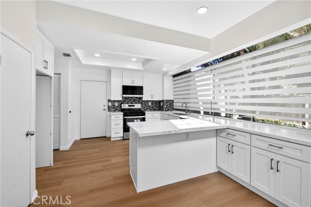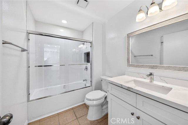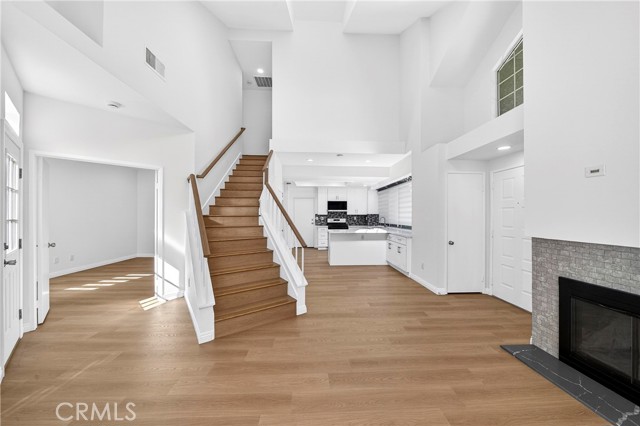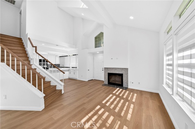 THE GLEN" IS TRULY ONE OF THE MOST DESIRABLE NEIGHBORHOODS IN LA MIRADA'S HILLSBOROUGH COMMUNITY.  This highly desirable three-bedroom, two-bathroom condo is move-in ready and offers all the updates you are seeking, including a one-bedroom downstairs. Upstairs, you will find two spacious bedrooms with a brand-new Jack and Jill bathroom. Upon entering, you will be greeted by the spacious living room, featuring vaulted ceilings and an inviting fireplace. The living room and dining room are open to the kitchen, creating an open floor plan. Numerous windows make this property exceptionally light, bright, and airy. The completely remodeled vinyl plank flooring runs throughout the interior. The brand-new kitchen boasts white shaker-style cabinets, quartz countertops, a stylish backsplash, a large pantry, a deep stainless-steel sink, and stainless-steel appliances. The first-level bedroom is a good size with private entry to the first-level full bathroom and overlooks a private patio area. Upstairs, the two additional bedrooms both feature vaulted ceilings, ample closets, and share the second full bathroom with a dual sink vanity. Both bathrooms have been updated with white shaker cabinets, brushed stainless fixtures, and quartz countertops. The laundry is conveniently located in the hallway adjacent to the garage entry. The paved brick patio offers a great place to barbecue separately from guests or use as a small garden area. This property is located in a very nice development surrounded by lush mature trees and numerous greenbelts. The quiet, relaxing community ambiance and surroundings are well-maintained by the Association. Direct access to the two-car garage is available, and there is ample guest parking nearby. Enjoy the Association pool and spa. The property is conveniently located close to shopping, restaurants, banks, grocery markets, transportation, and golf courses.