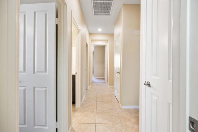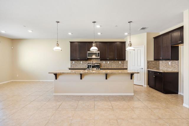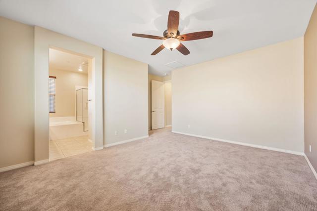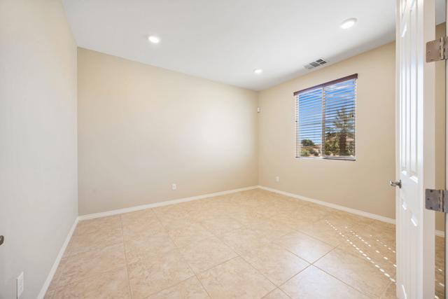 North Indio gated home on fee land in Aliante. This single-story 4 bedroom, 2 bath home offers approx. 2,032 sq. ft. on a low-traffic cul-de-sac with solar, a 3-car garage, and a long driveway for additional parking. The open-concept great room features expansive tile flooring, recessed lighting, and a stone fireplace. The kitchen opens to the living and dining areas and includes granite slab counters, a large island with bar seating, stainless appliances, dark cabinetry, and a walk-in pantry. A den off the main entry adds flexibility for a home office, media room, playroom, home gym, or possible additional sleeping space. Both bathrooms feature dual vanities, and the primary suite also includes a walk-in closet, soaking tub, and separate shower. The north-facing backyard offers a covered patio with recessed lighting, low-maintenance desert landscaping, and space to explore a future pool and spa. Residents enjoy a secure gated entry with a grand water fountain, plus a half basketball court, soccer practice area, dog run, playground, and illuminated walking trails. Well located near I-10, Golf Center Pkwy, revitalized Downtown Indio, and The Lights at Indio Golf Course, this is a compelling opportunity to secure a well-positioned North Indio home offering comfort and convenience.