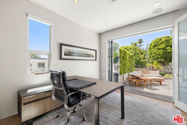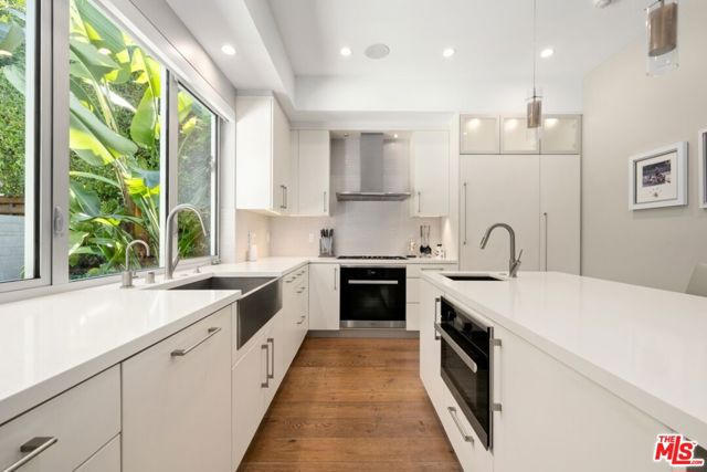 Tucked behind gates and surrounded by mature greenery, this ultra-private modern retreat sits on one of West Hollywood's most coveted blocks and epitomizes indoor-outdoor living at its finest. Just moments from Beverly Hills, the residence has been reimagined by its current owner to evoke the experience of a world-class luxury hotel. A foliage-lined entry leads into a hidden garden, a magical courtyard oasis that flows effortlessly into the living room. The first floor embraces a true open-concept design, with interiors that seamlessly expand to the front and rear gardens, creating a sanctuary of light, privacy, and calm. Wide-plank hardwood floors and a sleek fireplace anchor the living room, while the chef's kitchen dazzles with Miele appliances, a large island, and custom cabinetry. The adjacent dining and family room open onto a backyard escape complete with a covered, heater-equipped lounge, a sparkling pool with fountain, and a spa-all enclosed by soaring hedges for total seclusion. The attached garage, currently configured as a bespoke storage suite, offers flexibility for additional living, creative, or fitness space. Upstairs, the primary suite is a study in luxury, with abundant custom closets (including a converted third bedroom), refined window treatments and built-ins, a balcony, and a marble spa-like bathroom with dual sinks and a glass-enclosed shower. The second bedroom is bathed in natural light and spills onto a romantic rooftop patio. Additional amenities include a Control4 home automation system, motorized blinds throughout, and a comprehensive security system with cameras. Set in an unmatched central location, the home is minutes from the acclaimed dining, shopping, and nightlife of Robertson, Melrose, and Beverly Hills.