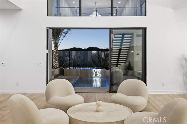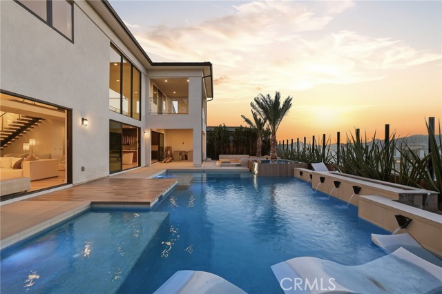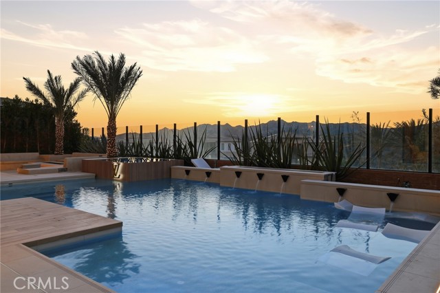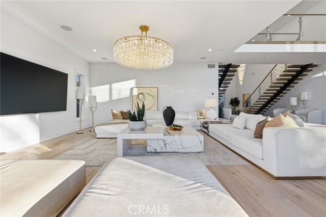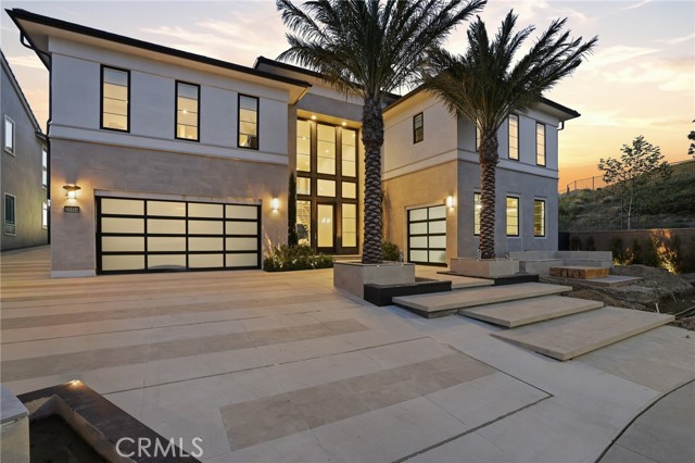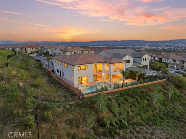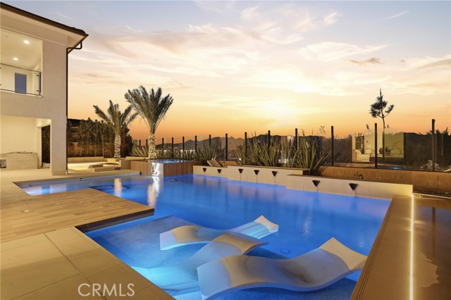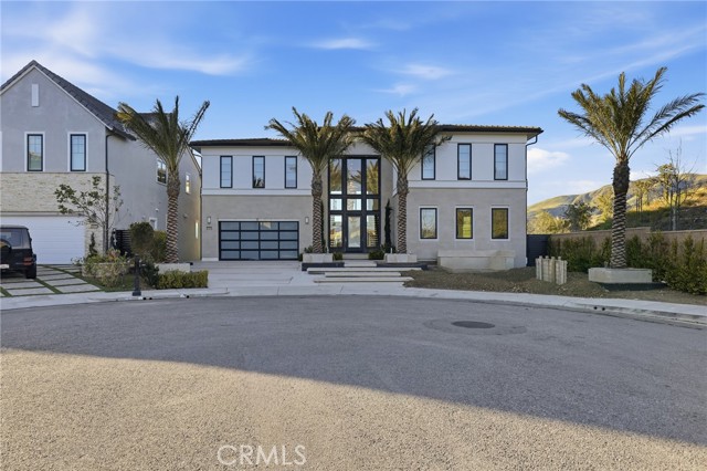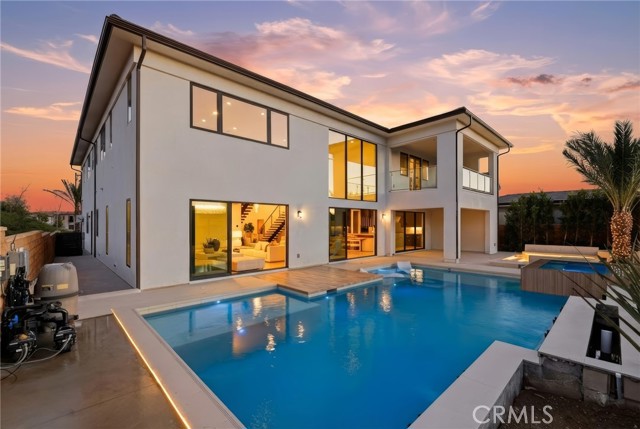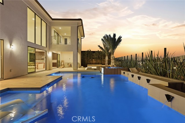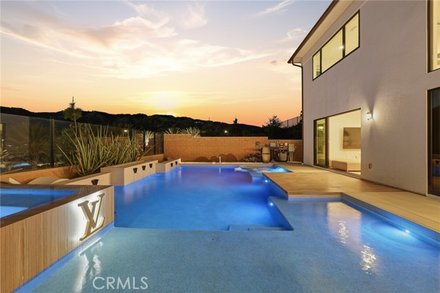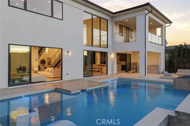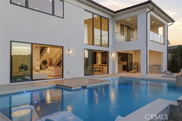 This exceptional estate offers over 5,400 square feet of thoughtfully designed living space, featuring 5 bedrooms and 6 bathrooms with a focus on scale, quality, and everyday livability. Clean architectural lines, soaring 20-foot ceilings, and an open layout create a sense of space and light throughout, while a striking floating staircase and Restoration Hardware chandeliers add a refined, elevated feel. Hardwood flooring spans the main level, tying the living spaces together with warmth and continuity. The kitchen is designed to impress, featuring Monte Blanc quartz countertops, custom cabinetry with full-height doors, and a premium appliance suite including Wolf, JennAir, and Sub-Zero. It opens seamlessly to the main living areas, where a built-in surround sound system enhances both entertaining and everyday comfort. Upstairs, the primary suite offers a private retreat with a spacious layout, spa-like bathroom, and generous walk-in closets. The outdoor space is equally well-appointed, highlighted by an oversized Pebble Tec pool with dual Baja shelves and an infinity spa, all surrounded by sleek porcelain slab hardscaping in both the front and back yards. Designed for both entertaining and relaxation, the setting offers a clean, modern aesthetic with low-maintenance appeal. With its strong architectural presence, high-end finishes, and well-executed design, this home delivers a balanced combination of luxury, comfort, and functionality.