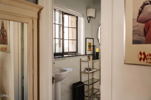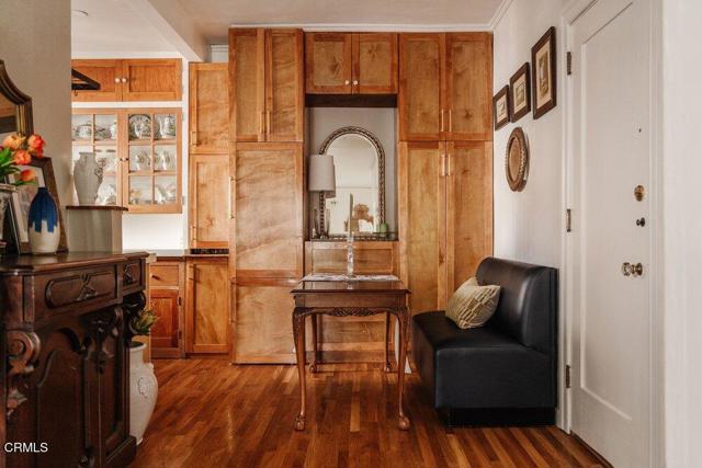 The Barcelona is located in the Playhouse District of Pasadena and convenient to a myriad of shopping and dining options! It was built in 1922 designed with charming Spanish Architectural details by Walter Follard. This charming unit is at the end so light streams in through its many windows. The open floorpan with high ceilings features the original windows, hardwood flooring, picture molding and custom cabinetry. The bright kitchen has been stylishly remodeled featuring Shaker style wood cabinetry with glass doors on the upper cabinets and quartz countertops. Most importantly you have your own laundry with a combination washer/dryer unit tucked under the countertop! A custom built-in extends into the dining area and cleverly disguises the refrigerator while also offering abundant storage. The bathroom has been remodeled as well using classic finishes that are elegant and dynamic. The HOA conveniently includes utilities as well as a 6'x4' storage space. The Barcelona is a unique building that has earned Historical status and as such, benefits from the Mills Act which offers a significant discount for your property taxes.
