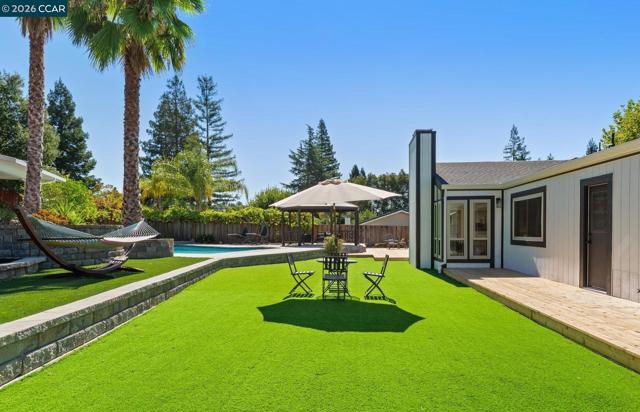 Gorgeous single story home in the Leander Hills of Danville. Beautifully renovated main home boasts 3 bd, 2.5 ba, 2065 Sq Ft w/ a separate 800 Sq Ft, Studio/Au pair/In Law unit, featuring a living room, 1 bed/1 bath. Total sq ft 2865. Expansive living room w/ soaring ceilings & a cozy fireplace. Open concept to the dining & kitchen area. The stunning updated eat-in kitchen features a large center island, Taj Mahal quartzite w/ waterfall edge, custom cabinetry, stainless steel appliances, ample storage & a walk-in pantry. Relax in the sun-filled Family room w/ fireplace, windows & sliding door to stunning pool area. Primary suite has vaulted ceilings, expansive closet space & sliding door to the backyard oasis. Remodeled primary bath w/ double sinks & walk-in shower. An entertainers delight! Step outside in the resort like backyard w/ solar heated sparkling pool, artificial turf, outdoor kitchen w/ built in BBQ, large pizza oven, pergola and several lemon, orange & fig fruit trees. Pool house has 1bd & 1ba & living room overlooking the outdoor kitchen and pool .Perfect for guests, In-laws, or a place to unwind and relax. Ample parking w/ a 3-car garage, & gated RV parking. Walking distance to top schools, trails, shops & easy freeway access. Make this beautiful home your own!