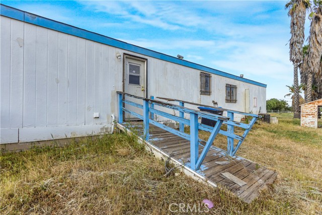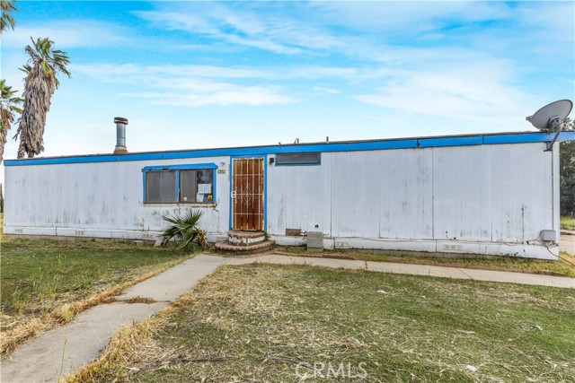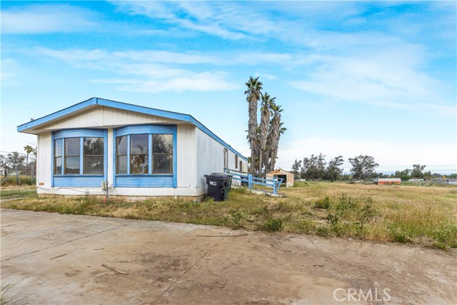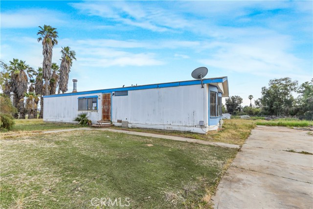Great opportunity on this 3 bedroom 2 bathroom manufactured home on a permanent foundation in the city of Perris. This 1344 square foot 1987 built single story home sits on a fenced 43124 square foot corner lot with tons of open usable flat space including a very long driveway with RV potential parking at the end. The home opens into the living room which has built in shelving and coat closet as well as a brick wood burning fireplace. Next to the living room is a dining nook followed by the kitchen. The kitchen is highlighted with a stainless steel sink with large window overlooking the backyard, butcher block countertops as well as a breakfast counter with seating for two and a good amount of cabinet and counter space with hookups for a gas range, dishwasher as well as a niche for refrigerator. Going through the kitchen is a large laundry room with washer and dryer hookups and a door providing access to the backyard. The laundry room connects to the hallway through its other door leading to the hallway bathroom. The hallway bathroom has a single sink vanity, with shower and tub combo. Two bedrooms are beyond the bathroom. The first bedroom features vinyl flooroing with 3 large windows overlooking the side yard of the home. It has a large closet with mirrored sliding doors. The second bedroom also features large windows allowing lots of natural light as well as wood panels and a large closet. The primary suite is on the other side of the home beyond the living rom and kitchen. It features high ceilings and a large clost with wood panel doors. The bathroom has a large soaking tub with separate shower and a large vanity with single sink and lots of cabinet space. The backyard is quite large with extending from the corner of Cowie and Deprad. The lot features many mature palm trees, a shed with plenty of open space to make this blank slate perfect for horses, agriculture or any other rural living desires. This home is located conveniently close to Highway 74 providing quick access to both the 215 and 15 freeways. It is near shopping, dining and convenience stores with plenty of hiking and nature attractions nearby.