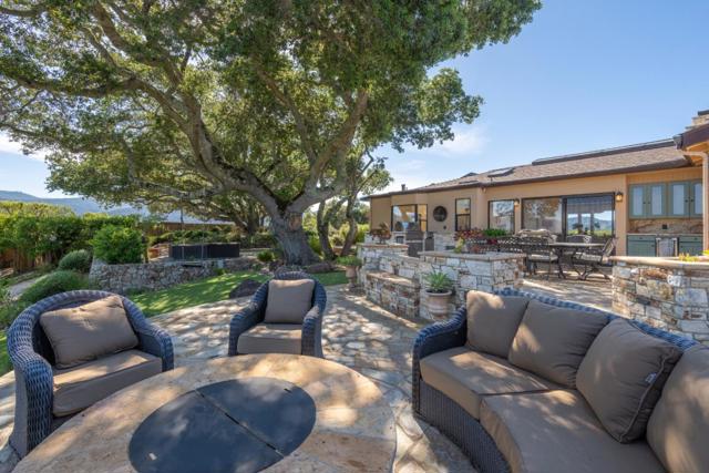 STUNNING 360 VIEWS in coveted neighborhood of Los Tulares...Private, gated Carmel Valley retreat with breathtaking sunrise and sunsets . This beautifully remodeled single-level ranch home offers 3 bedrooms and 3 bathrooms, designed for effortless indoor-outdoor living. At the heart of the home is an inviting open-concept kitchen with custom cabinetry, an oversized island, and a stunning La Cornue rangeperfect for gathering and entertaining. Natural light fills the home through skylights and open beam ceilings, complemented by warm travertine and hardwood floors. Step outside to your own resort-style setting with expansive decks, stone patios, an outdoor kitchen, fire pit, and a solar-heated pool with waterfalls. The grounds are incredibly private, surrounded by majestic oaks, lush gardens, fruit trees, and abundant wildlife. A detached studio with sweeping views offers flexible space for a home office, art studio, or guest retreat. Set on a generous lot, this property embodies the peace, privacy, and natural beauty that define Carmel Valley living.