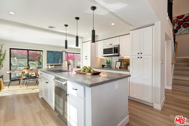 Stunning Modern Mediterranean Retreat on a Rare Cul-de-Sac Lot in Culver City. Thoughtfully designed and meticulously remodeled, this gorgeous 2-story, 4-bedroom home sits on an expansive 8,108 sq ft lot in a tranquil cul-de-sac within Studio Estates just moments away from the restaurants, shops, and energy of Downtown Culver City. Located in the highly sought-after Culver City Unified School District, this home checks every box for discerning buyers. A sweeping front driveway sets the tone, offering exceptional privacy and ample space for up to 8 cars leading to a 2-car garage. The lush grounds feel like a private oasis, featuring a sprawling grassy yard, multiple patio spaces, outdoor dining, a built-in barbecue center, and a cascading fountain surrounded by mature trees. Inside, soaring vaulted ceilings and wide-plank French oak luxury vinyl floors create a bright, airy atmosphere. The living room is anchored by a sleek electric fireplace framed in dramatic floor-to-ceiling Italian porcelain, with picture windows overlooking the quiet, no-through-traffic street. The dining area opens seamlessly to the backyard, perfect for indoor-outdoor entertaining. The chef's kitchen is anchored by a Bertazzoni range and framed by Italian porcelain backsplash, with white soft-close cabinetry, grey quartz countertops, and a center island with seating. It flows into a casual breakfast area and family room where multiple sliding glass doors dissolve the boundary between indoors and out. The flexible floor plan includes a downstairs bedroom served by an updated full bath, ideal for guests or a home office. Upstairs, the primary suite features vaulted ceilings, a walk-in closet, and a serene bath with an oversized walk-in shower, porcelain tile walls, tumbled marble floors, hand shower, and a rain shower head. Two additional bedrooms share a second updated bath. Set on a street where neighbors gather and kids play, this home delivers the rare combination of privacy, community, and walkability, steps from Culver City's top restaurants, theaters, and weekly farmers market, and minutes from Sony, Amazon & Apple offices/studios.