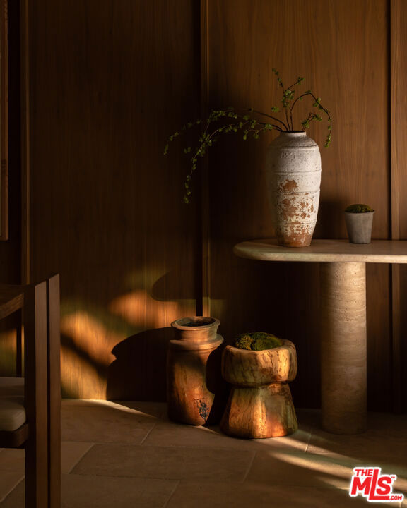 Sculpted Serenity: A timeless design ethos inspired by Amangiri where nature, light, and material exist in perfect harmony. An architectural statement above the Sunset Strip, spanning a single level across 4,600 square feet, where every surface feels sculpted rather than built. Effortless California living through world-class materials. Walls of Moroccan hand-tumbled limestone set a warm, organic tone, complemented by Egyptian limestone floors that flow seamlessly throughout. Custom walnut millwork adds depth and texture, grounding the minimalist aesthetic with natural warmth. The great room unfolds beneath high ceilings that capture shifting light, centered around a Titanium travertine lounge bar a sculptural focal point of the home. Designed for those who value art and beauty, interiors feature expansive art walls with subtle, specialized lighting. The silver-travertine fireplace and powder room bring quiet sophistication, their textures echoing the surrounding landscape. In the kitchen, a travertine hood and bespoke walnut cabinetry reflect refined simplicity and craft. The primary suite is conceived as a world-class spa retreat, with a Gold Dune stone bath, steam shower, and wellness and massage room designed for deep restoration. Each bedroom offers tranquil proportion and a seamless connection to nature. Clad in Accoya wood siding that blends with the hillside, the home feels organically rooted in its environment. A perfectly scaled pool sits in total privacy, framed by mature trees and granite outcroppings a serene retreat where architecture and landscape exist in perfect balance. 4,600 square feet includes garage