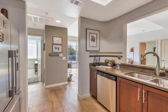 Beautifully maintained 2 bedroom unit on the 3rd floor. Wonderful sunset views and open floor plan. Modern kitchen with wood cabinets, appliances and pass through to the dining area. Primary bedroom has a walk in closet, while the other bedroom has a generous wall closet. Both baths are spacious and well appointed. Balcony has nice views of the sunset and foothills. Secured building with parking below, elevators, and mail center.