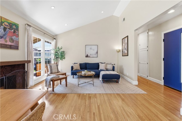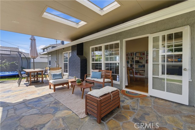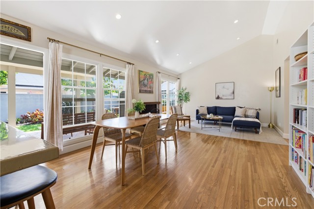 Light filled mid-century modern home with a seamless open layout and effortless indoor-outdoor flow. This 3 bedroom, 2 bath home features beautifully refurbished hardwood floors and a stunning great room where the living, dining, and kitchen spaces come together under vaulted ceilings with floor-to-ceiling windows overlooking the backyard, filling the home with natural light. The kitchen offers warm wood-toned cabinetry, tons of counter space, and an island. The spacious primary suite with upgraded bath is privately situated, with two additional bedrooms and a full bath on the opposite side—an ideal floor plan. The backyard is perfect for entertaining with a covered flagstone patio with skylights, a vegetable garden, and generous outdoor space. Additional features include central air and heat, copper plumbing, and a newer roof. Located in the desirable Plaza neighborhood near parks, shopping, restaurants, and award-winning Cubberley K–8 School.
