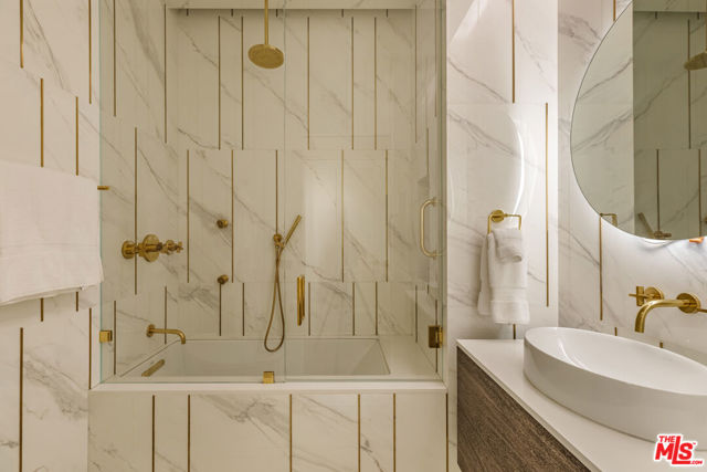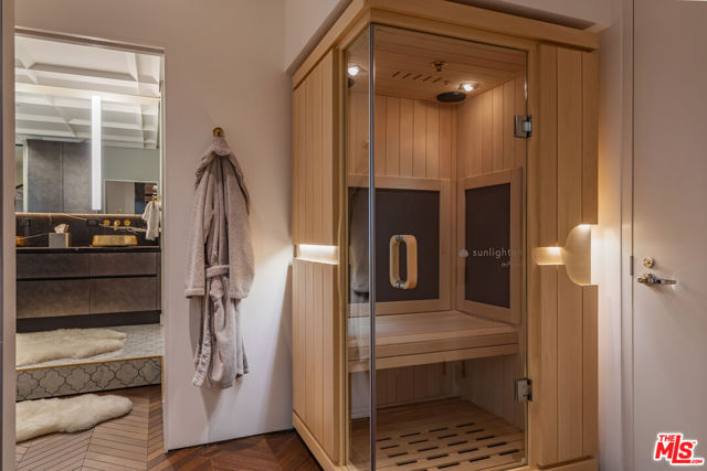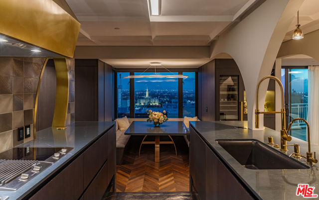 Turnkey Designer Furnished Condominium. Nestled within the distinguished Remington Private Residence Tower in Westwood and following a three-year gut renovation, this exquisitely designed 3/4 bedroom, 3.5 bathroom condominium is a masterclass in modern luxury and timeless sophistication in pristine move-in condition. Complete furnishings available for purchase, including custom-made furniture, designer lighting and chandeliers, custom rugs, Frette linens, comprehensive AV system, window coverings, extensive kitchen cookware, appliances and flatware. Encompassing 3,283 square feet, the home welcomes you from your Private Elevator directly into your gracious formal foyer, unfolding into a sun-drenched, open-concept living space framed by floor-to-ceiling windows and an extensive terrace that captures breathtaking panoramas of the city skyline. The interiors unfold with an artful balance of drama and refinement. Rich chevron-patterned hardwood floors and custom coffered ceilings guide you to the striking black marble gourmet kitchen, where bold design meets everyday functionality. State-of-the-art Miele appliances, a walk-in pantry, and a custom breakfast nook create an inviting space that transitions effortlessly from quiet morning rituals to vibrant gatherings. The adjacent office/den/4th bedroom outfitted with bespoke cabinetry and sliding glass doors, doubles as a versatile sanctuary with access to a private terrace. A dedicated laundry room and extensive storage add convenience. A marble-clad hallway leads to a serene guest suite, designed with privacy and comfort in mind. On the opposite wing, the primary suite defines luxury living. An entryway lined with mirrored panels sets the tone, while recessed and paneled custom ceilings and expansive windows frame the glittering cityscape. The suite extends to a private terrace, a tranquil haven from which to savor the views. The ensuite bathroom is a spa-like retreat, featuring a stone-clad walk-in shower, a deep soaking tub, a private infrared sauna, and a custom dressing room that rivals the most elegant ateliers. An additional ensuite guest suite and formal powder room complete the home. Throughout, thoughtful design details -architectural arches, custom contemporary finishes, and discreet hidden storage - imbue the residence with an air of bespoke sophistication, where every inch has been meticulously curated. Modern conveniences such as a Crestron smart-home system, automated shades, and custom lighting ensure effortless living, seamlessly blending luxury and technology. As part of the two dedicated parking spaces, a coveted submeter purchased for a private EV charger. Additional separate storage room and wine locker are included. More than a residence, this exceptional offering sets a new standard for vertical living in Los Angeles' most coveted address- a harmonious fusion of artistry, design, and comfort. Residents of The Remington enjoy unparalleled amenities synonymous with elevated living: 24-hour valet parking, a stately library and fireside lounge, a grand banquet hall, an outdoor pool, a state-of-the-art fitness center, and expansive alfresco dining areas complete with a cozy outdoor fireplace.