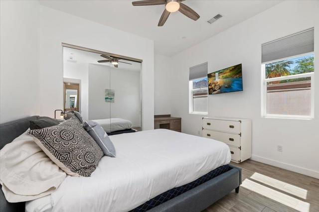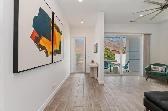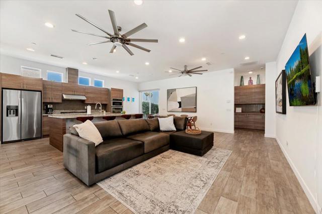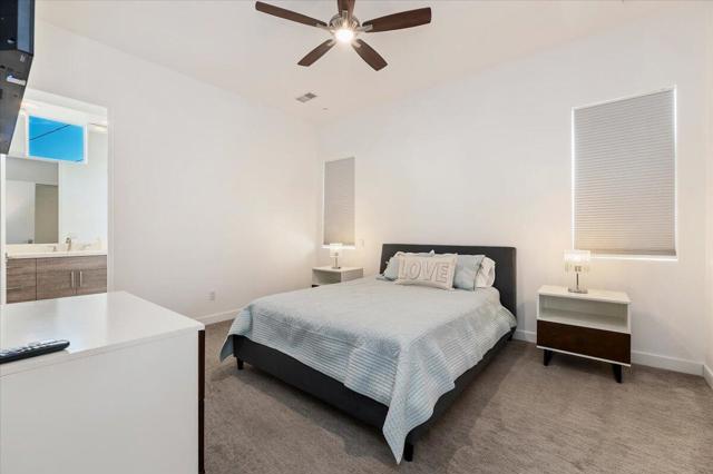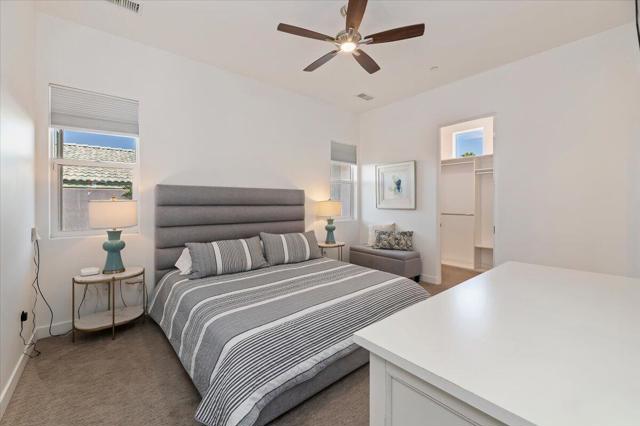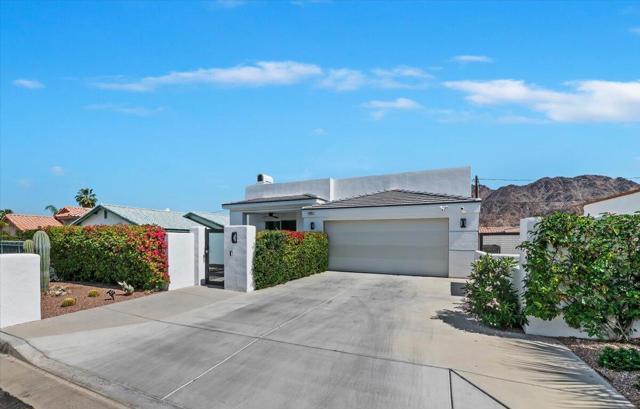 Refined West Facing desert-modern style home, featuring high ceilings and a bright, open feel. The floor plan offers two private suites, plus an additional bedroom that works perfectly as a guest room or home office with built-in workspace. Natural light pours in through elevated windows placed for both privacy and views, while quality finishes like custom cabinetry and striking stone surfaces add a polished touch throughout. The kitchen is designed for everyday living and entertaining, complete with an oversized island, ample storage, and integrated stainless appliances. The home embraces the indoor-outdoor lifestyle, with generous openings that connect living spaces to the outdoors and frame scenic mountain backdrops. Out front, enjoy a private pool and spa with a lounging shelf, along with a covered patio for shaded relaxation. A separate side yard provides space for outdoor dining or weekend gatherings. Ideally situated near top golf courses, parks, and just minutes from the shops and restaurants of Old Town La Quinta, this home offers a comfortable and stylish desert lifestyle.