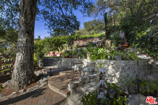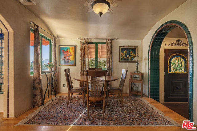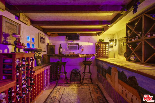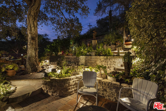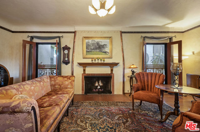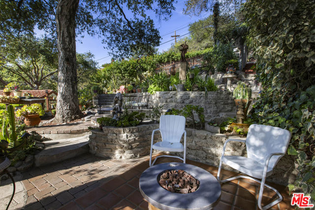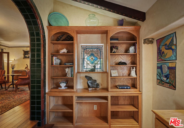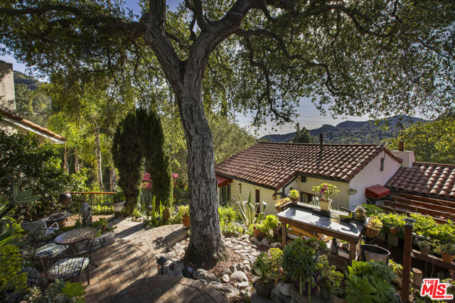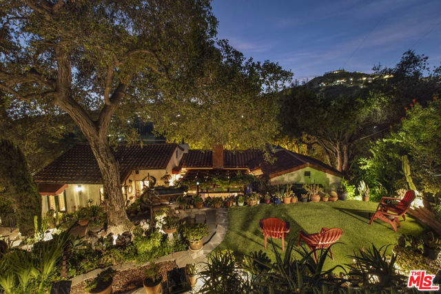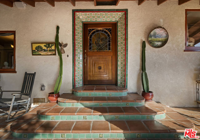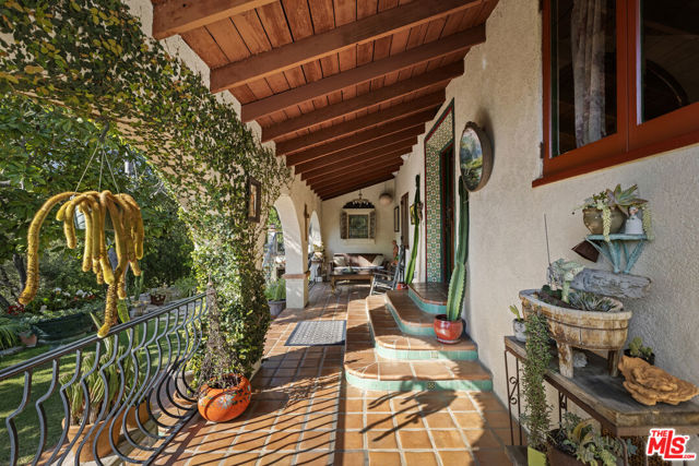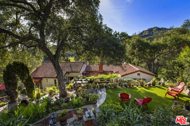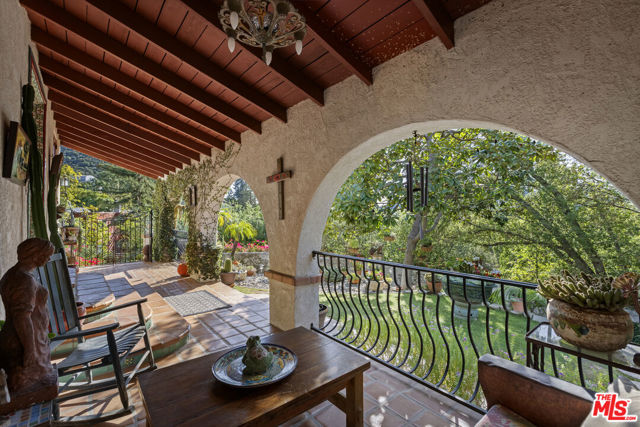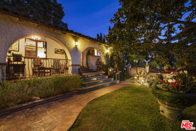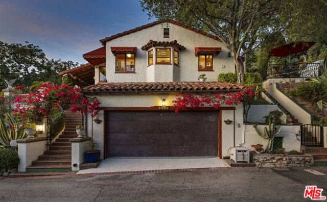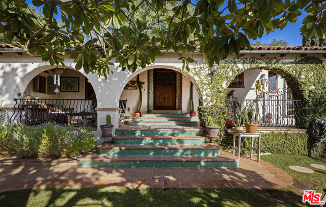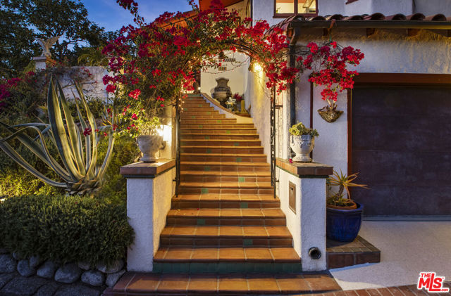 Casa de Manana- Spanish Colonial Revival. Timeless Spanish Colonial Revival residence set on a private canyon lot with sweeping western sunset and city views. Lovingly restored with exceptional attention to detail, blending classic Mediterranean warmth with artisanal craftsmanship. Features include a traditional red clay tile roof, arched entryways, lath-and-plaster walls, handmade tile accents, and beautifully preserved original details throughout. Charming courtyard entry with fountain and magnolia tree leads to a romantic portico and below-ground wine bodega. Interior highlights include tongue-and-groove oak and mahogany floors, stained wood doors, leaded stained-glass windows, original light fixtures and hardware. Elegant living room with gas fireplace adorned with rare Spanish tiles opens via French doors to a serene patio, koi pond, and manicured gardens beneath a century-old oak. Spacious chef's kitchen with canyon views, stone countertops, breakfast bar, rich cabinetry, Wolf range, and breakfast nook flows seamlessly into dining and family areas. Additional upgrades include a new electrical panel, sewer, and all water pipes replaced with copper. Private deck with hot tub and fire pit provide the perfect setting to enjoy unforgettable sunsets. A rare and beautifully preserved architectural offering.