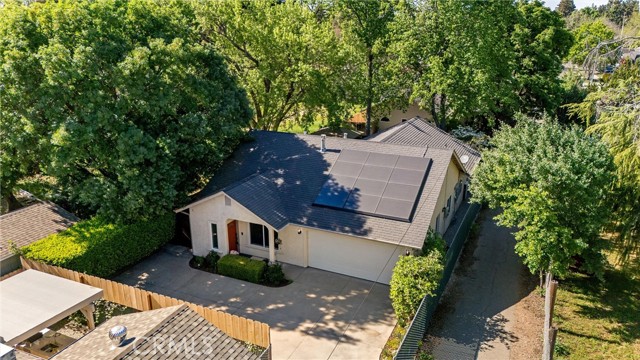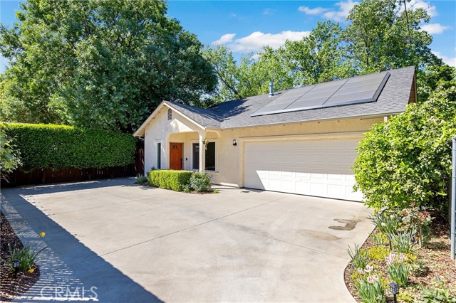 Stop worrying about rising PG&E rates—this beautifully maintained single-story home offers an owned solar system with battery storage and is locked into highly coveted NEM 2.0 benefits, delivering significant monthly savings and peace of mind during peak summer months. Tucked away on a private, quiet flag lot in Chico, this centrally located yet secluded 3-bedroom, 2-bathroom home is impeccably clean and truly move-in ready. Inside, you’ll find refreshed interiors with freshly touched-up paint and stylish luxury vinyl plank flooring throughout, along with modern upgrades including a renovated bathroom and newer water heater, as well as a new kitchen sink and water filter. The primary bedroom features a sliding door to the backyard and a stylish barn door leading to the en suite bathroom, complete with double sinks, a soaking tub, and a separate shower. Thoughtful improvements like installed gutter guards make for easy, low-maintenance living year-round. Step outside to your own backyard oasis designed for the Chico lifestyle—perfect for relaxing or entertaining under the pergola or enjoying outdoor movie nights with the included projector and screen. The space is enhanced by an edible landscape featuring mature fruit trees, including apple, mandarin, and lemon, as well as a raised garden bed. Ideally located just minutes from Enloe Medical Center, shopping, and the highly anticipated Henshaw Park, this Chico gem blends modern efficiency with a peaceful, tucked-away feel—homes with this level of energy independence don’t last long!