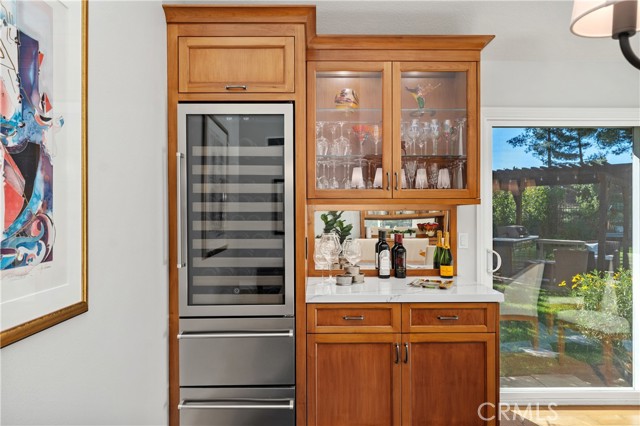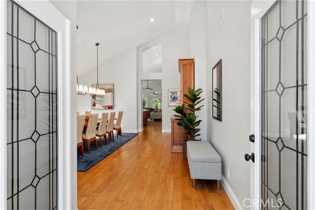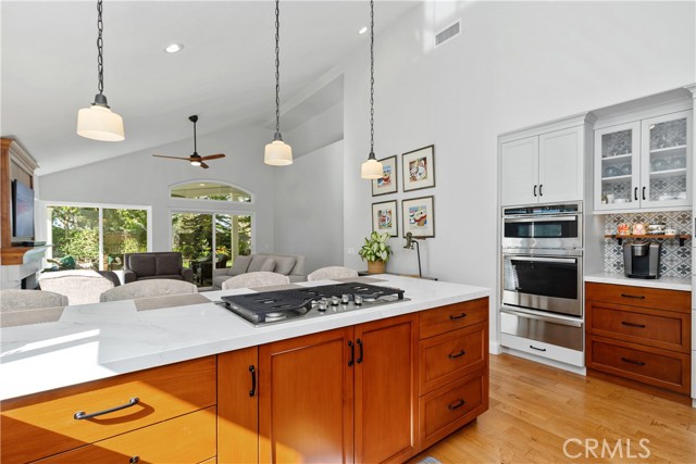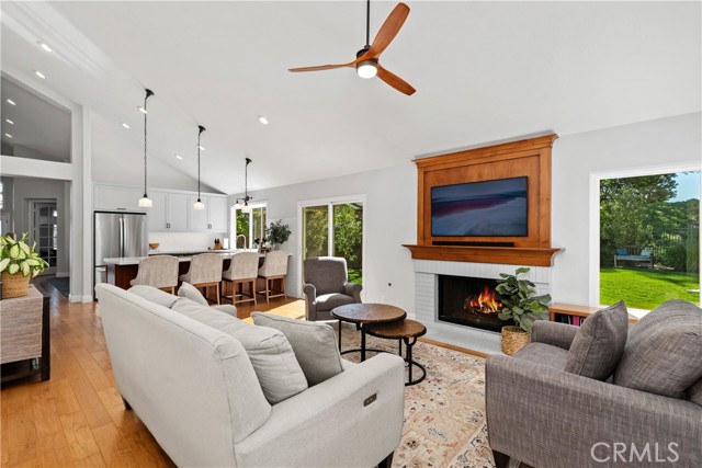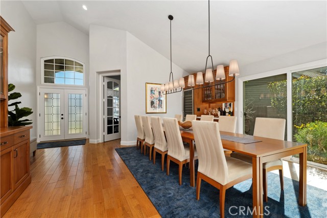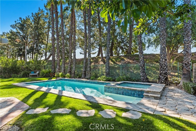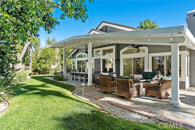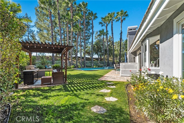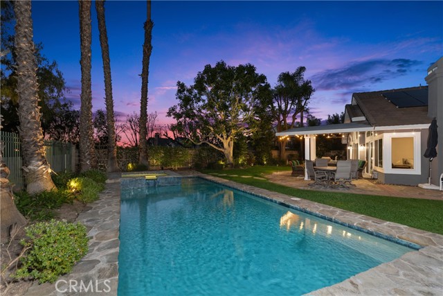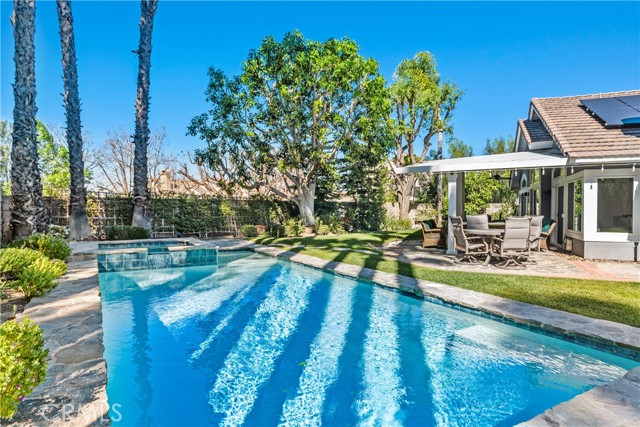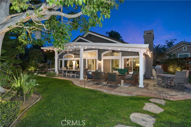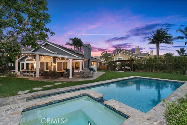 The best of Dove Canyon living. This immaculate 3 bed, 2 bath plus office, single-level home is ideally situated on a prime cul-de-sac and an oversized 10,500 sq ft corner lot, offering exceptional privacy and a beautifully designed wraparound yard with a saltwater pool, spa, lush gardens, and two covered verandahs…perfect for indoor-outdoor living and entertaining. Set within the prestigious 24-hour guard-gated community of Dove Canyon, the home welcomes you with a light-filled interior, high ceilings, hardwood flooring, and a thoughtfully designed single-story layout. The fully remodeled chef’s kitchen serves as the heart of the home, featuring quality finishes, upgraded cabinetry, and a breakfast bar, all opening to the main living spaces. The adjacent family room offers a fireplace with a wood mantle and built-in media cabinet, a ceiling fan, and dual sliding doors that open to the backyard. A spacious formal dining room includes built-in cabinetry, a buffet, wine fridge/bar, and an additional sliding door to the backyard…creating an effortless flow for everyday living and entertaining. The primary suite offers dual closets, a ceiling fan, remote-controlled blinds, and a fully remodeled bathroom with updated finishes and an oversized walk-in shower. Two secondary bedrooms offer upgrades…one with a custom closet system, the other with a built-in desk…while the guest bathroom has also been fully renovated. The dedicated office features built-in shelving and storage, new shutters, and a ceiling fan. Additional improvements include new toilets, updated lighting, a new front door, fresh interior paint, custom hall storage, updated electrical, and a smart thermostat. Major upgrades include a new HVAC system (A/C, furnace, ducting), Halo water softener, Sunrun solar with backup battery, new pool/spa heater, and a whole house fan. The expansive wraparound yard features a saltwater pool and spa, covered verandah with lighting and fans, and a separate BBQ area for outdoor living. The home has been meticulously maintained with regular pest control, HVAC servicing, drain maintenance, resealed hardscaping, window cleaning, and exterior washing. The finished 2-car garage includes epoxy flooring, built-in cabinetry, storage, a workbench, and a new opener. A rare combination of location, upgrades, and pride of ownership, this move-in ready home offers one of the finest opportunities in Dove Canyon with a true resort-style lifestyle.