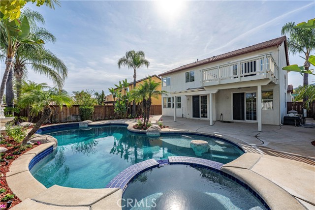Beautifully updated 2-story corner-lot pool home offering 5 bedrooms plus a loft, 3 bathrooms, and 2,457 square feet of functional living space. This open floor plan features fresh interior paint, new carpet, recessed lighting, and abundant natural light throughout. The kitchen with center island opens to the family room with fireplace, creating a seamless living and entertaining space. Two bedrooms are located on the main level along with a 3/4 bathroom, ideal for guests or flexible living. Upstairs offers three additional bedrooms, a full hall bathroom, and an oversized loft/bonus room. The primary suite includes a full bathroom with dual sinks, separate shower, and soaking tub. Additional highlights include dual pane windows and central AC. Additional main floor features include an individual laundry room and direct access to the 2-car attached garage with epoxy flooring. The backyard is designed for outdoor living and entertaining, featuring a newly finished pebble tec pool and spa, covered patio, and built-in BBQ area. The spacious 9,147 square foot lot offers privacy and mature landscaping. An upper-level balcony captures hillside and neighborhood views. Conveniently located near parks, schools, shopping, and commuter access.
