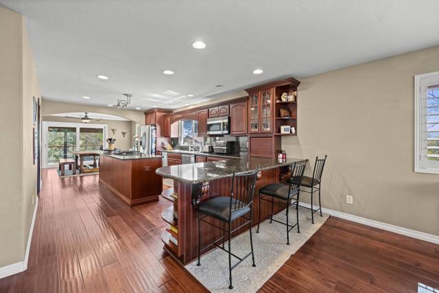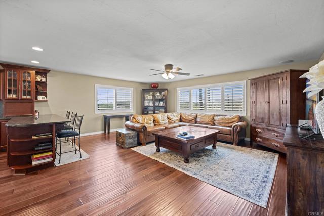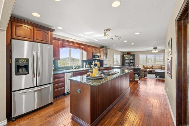 Beautiful Split-Level Home with Panoramic Views in Escondido Enjoy the best of California living in this well-maintained, custom split-level home, perfectly positioned to capture panoramic views and stunning sunsets. Whether you're relaxing after a long day in your jacuzzi or hosting friends and family, the setting provides a peaceful and scenic backdrop. The home features a spacious open floor plan, ideal for both everyday living and entertaining. The gourmet kitchen is thoughtfully designed with granite countertops, a large center island, and hardwood floors, offering plenty of space to cook and gather. In the family room, a cozy fireplace adds warmth and charm, while the large outdoor deck is a great place to entertain or simply enjoy the beautiful California weather. Dual-pane windows and plantation shutters throughout the home offer comfort, style, and energy efficiency. All main living areas are located on the primary level, with a bonus room and full bathroom downstairs—perfect for use as a guest suite, home office, or optional fourth bedroom. The property also includes RV parking and is centrally located in Escondido, close to schools, shopping, dining, and more. This home offers a great balance of space, functionality, and location.