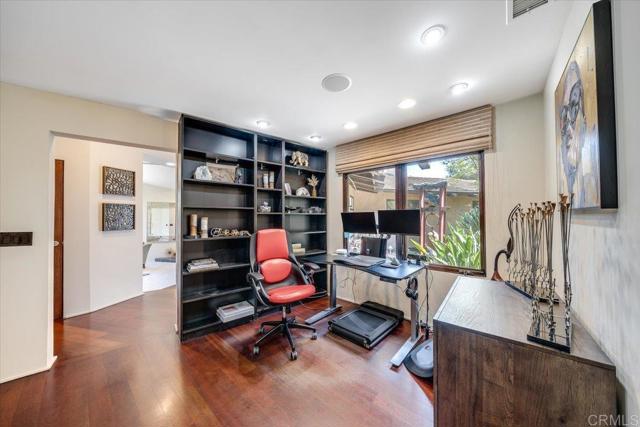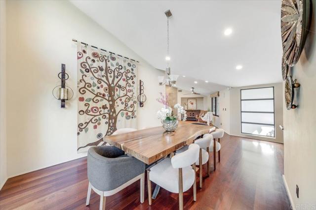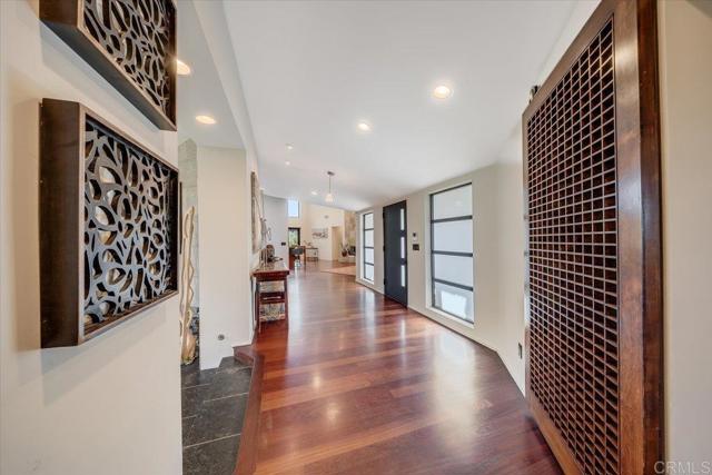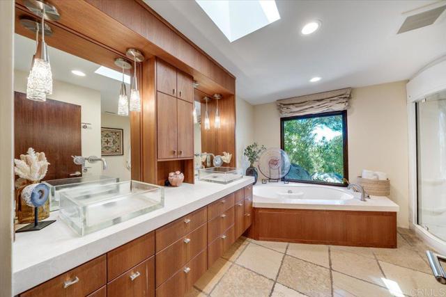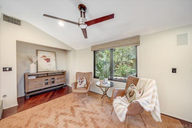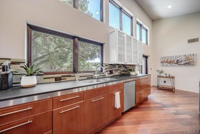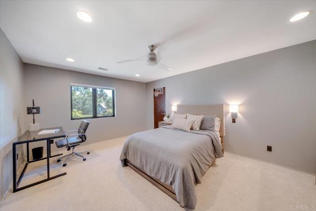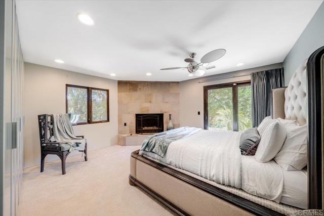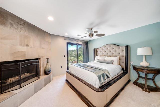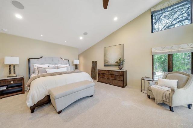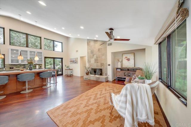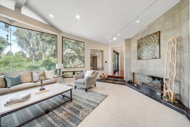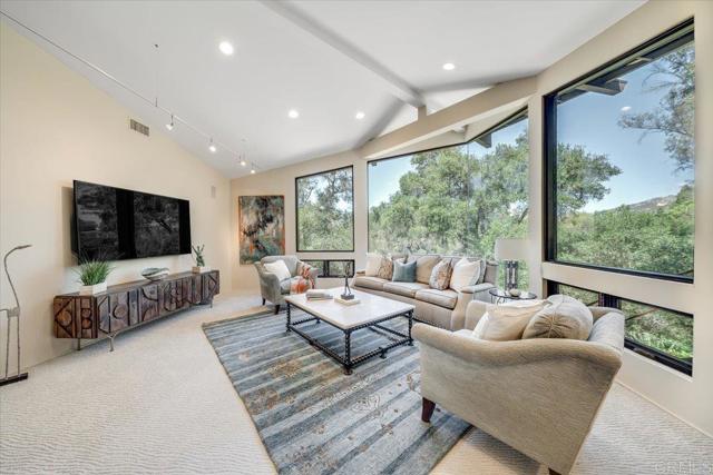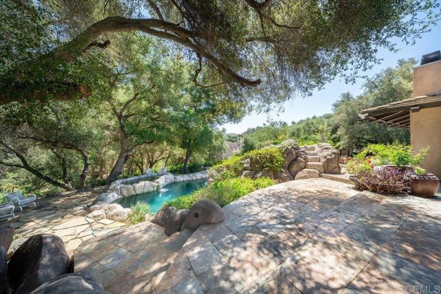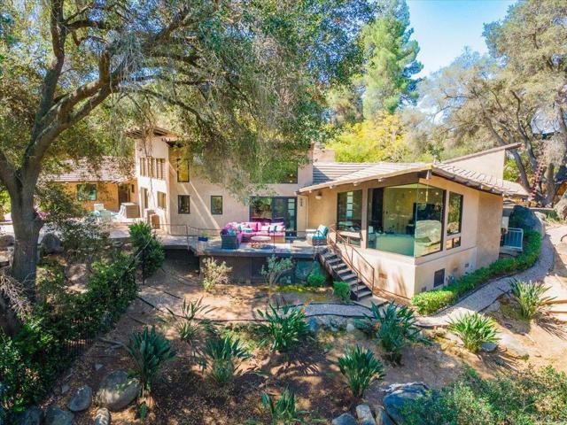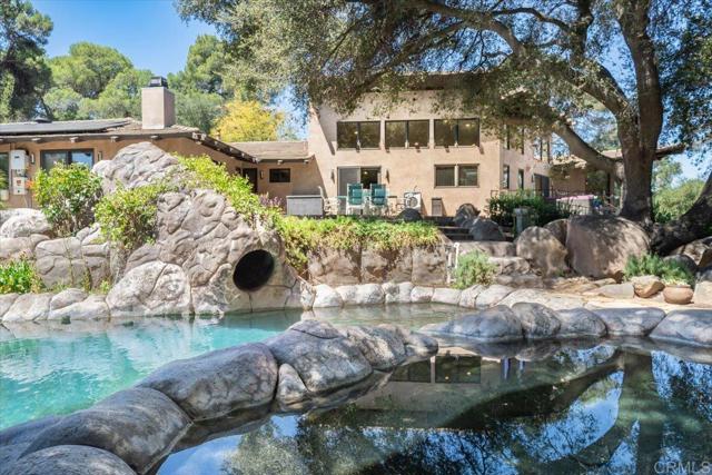 Tucked within the highly sought-after Green Valley community of Poway, this exceptional single-story estate offers a rare opportunity to own over two acres of private, park-like grounds in one of North County’s most desirable settings. Surrounded by mature trees, lush landscaping, and a natural creek that meanders through the property, the home evokes a serene, retreat-like atmosphere—reminiscent of living in your own private park or treehouse sanctuary. Spanning approximately 4,379 square feet, the residence is thoughtfully designed to maximize natural light and seamlessly connect indoor and outdoor living. Expansive windows, vaulted ceilings, and multiple sliding glass doors frame picturesque views from nearly every room, bringing the beauty of the outdoors inside. The flexible floor plan includes multiple living and entertaining spaces, highlighted by a spacious great room and an inviting kitchen designed for gathering. The property features 5 generously sized bedrooms, including a private primary suite with its own fireplace, and tranquil views of the surrounding landscape. An attached ADU with an additional bedroom and bath, provides added versatility—ideal for multigenerational living, guests, or potential rental income. Outdoors, the grounds truly set this property apart. Enjoy a resort-style setting complete with a free-form pool and spa, expansive patios, and open lawn areas—all framed by the peaceful presence of the creek and natural surroundings. Whether hosting gatherings or enjoying quiet moments in nature, the possibilities are endless. Set on over 2.18 acres, this is a rare offering in Poway—combining space, privacy, and a one-of-a-kind natural setting, all just minutes from top-rated schools, dining, shopping and more.