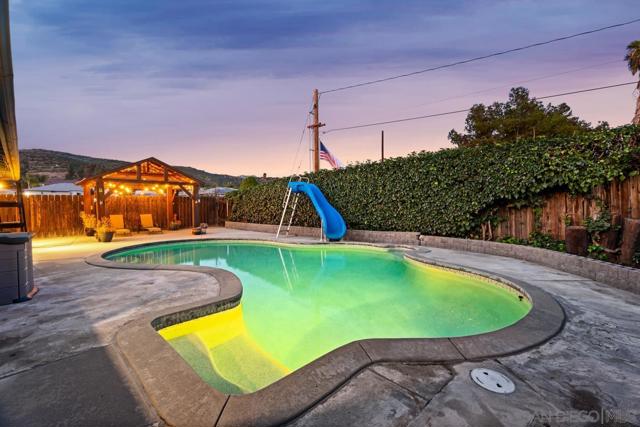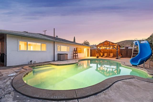 MOTIVATED SELLER! Great location! Owned Solar–no monthly electric bills! Sparkling saltwater Pool–recently replastered with solar heat and slide. Open-concept living room, hugely spacious and ideal for gatherings. Granite kitchen counter tops with plenty of cabinets. High ceilings for a bright, open feel with plenty of natural light. Spacious master suite features a huge walk-in closet, private bathroom. 3 more spacious bedrooms and 3 full bathrooms. Newer A/C unit. Finished Garage, new concrete flooring, stunning wood ceiling, and epoxy finish, perfect as a family room or bonus space. Newer concrete driveway. Low maintenance yard. Enclosed front patio – perfect space to unwind. Charming gazebo, equipped with lighting for relaxing evenings or entertaining guests. Private Road Access – Peaceful and secluded. Perfectly situated just minutes from downtown Lakeside, the rodeo grounds, Lindo Lake, and more! Don't miss your chance to own this gem in the heart of Lakeside!
