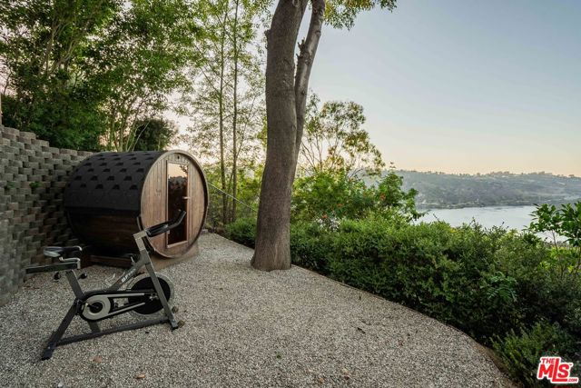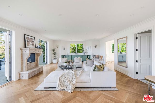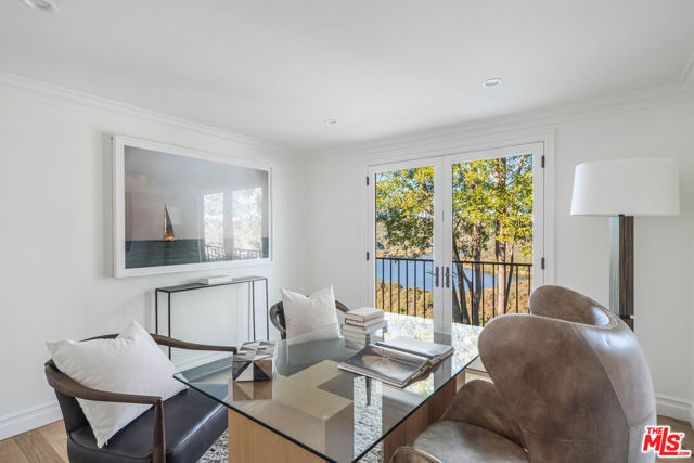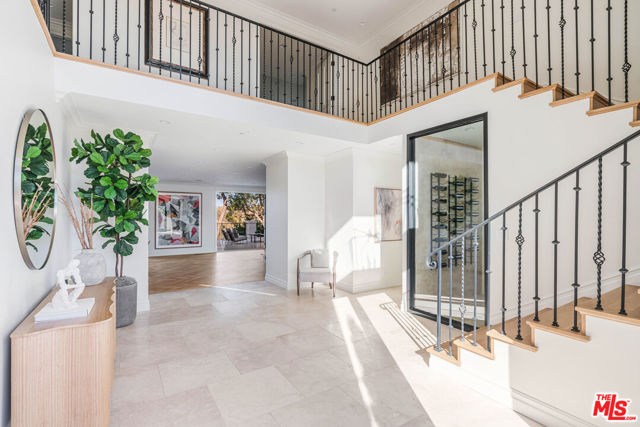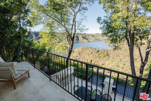 Stunning Contemporary Mediterranean home completely rebuilt and located behind gates on a private hillside in Bel Air. 1 of only 5 properties on Bel Air Road with unobstructed panoramic views of the Stone Canyon Reservoir and rolling hills beyond. Set on nearly half an acre, this home offers 6 bedrooms, 9 baths, a bright open floor plan with a warm minimalist aesthetic. Designed to capture the feeling of a European lakeside villa. A grand two-story entry opens to spacious living areas with White Oak herringbone floors and stunning water views. The gourmet kitchen features Thermador appliances, a La Cornue range, large island with breakfast nook and butler's pantry. Main rooms flow to a resort-style backyard with pool, spa, outdoor kitchen, dining areas and lush landscaping. The primary suite includes a private terrace, lounge, dual spa-like baths and walk-in closets. The lower level offers a wellness retreat with gym, cold plunge, steam shower and outdoor barrel sauna. Additional features include smart home systems, elevator, wine cellar, 100 ft gravel driveway with parking for over 10 cars. A private gated compound offering exceptional design, privacy and breathtaking views.