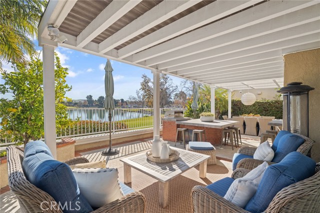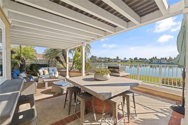 Location, location, location! Welcome to 4 Rushingwind, a rare lakefront opportunity in the prestigious Woodbridge community. Perfectly situated on the shores of South Lake, this residence offers breathtaking water views and exclusive backyard access to launch HOA-approved vessels. This home has undergone a comprehensive professional transformation. The remodeled kitchen features custom shaker cabinetry, quartz countertops with a matching backsplash, floating shelves, a pantry with a chic barn door, and high-end Thermador appliances including a professional range, commercial hood, and integrated microwave drawer. The first floor offers multiple living and family areas, including a dining room with bi-folding doors that create a seamless indoor-outdoor transition. The outdoor oasis features an upgraded private spa with a new heater and variable speed pump, plus a custom island with a built-in BBQ and concrete countertops. Upstairs, the primary en-suite is a true retreat with unobstructed lake views, cathedral ceilings, exposed beams, and a private deck. The spa-like primary bath includes a wall-to-wall tile shower and dual vanities. Additional highlights: a stylishly updated hallway bath, a bright upstairs bonus room/office, upgraded ceramic tile and engineered wood flooring, and a custom carpet runner. Modern upgrades include Hunter Douglas powered shades, LED recessed lighting, and a 2-car garage with custom cabinets and epoxy floors. Move-in ready and perfectly positioned to enjoy the best of Irvine's competitive market!