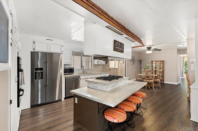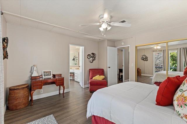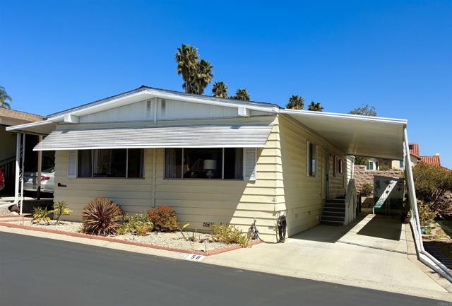 Lovely well cared for and updated home located in a 55+ resort style community with many amenities and city rent control! This home features waterproof Luxury Vinyl Plank floors throughout, as well as updated interior paint, molding, and fixtures. The Island Kitchen features new quartz counter tops, backsplash, and all newer appliances (with the exception of the oven.) This open floor plan has Separate Living and Family rooms providing plenty of space for leisure or entertaining. A solar tube in the Family room helps make this home feel bright and cheerful. The Primary Suite has a door that leads out to a raised garden bed and private back patio. There is Central A/C in addition to ceiling fans located in both bedrooms and the Living and Family room for a total of four. An oversized enclosed porch offers additional usable space not accounted for in the 1440 Sq.Ft.; This space makes a great sitting room, office, exercise or hobby room. The exterior offers TWO storage sheds for even more storage space. Rancho Vallecitos is a beautiful, 5-Star, resort style community for persons 55 years of age and over (2nd resident can be age 45+). One of the most beautiful manufactured home communities in California, Rancho Vallecitos has great views that can be enjoyed throughout the community, plus many social activities and amenities. Amenities include a clubhouse/recreation building, pool & spa, library, gym, billiards room, card tables, game and craft room, putting green, dog park, RV parking for an additional cost, and so much more! Space rent is $716.34 and park is under city rent control.