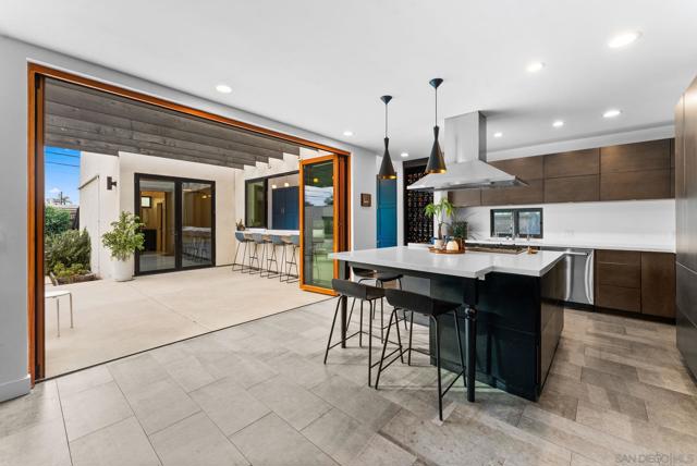 A rare blend of timeless character and elevated design, this Modern Spanish residence in the heart of Normal Heights has been thoughtfully reimagined for today’s lifestyle. Warm natural light, and sleek black-framed windows create a bright, refined feel throughout, complemented by engineered wood flooring and curated finishes. At the center of the home is a showpiece chef’s kitchen featuring Bertazzoni appliances, quartz countertops, custom modern cabinetry, and statement lighting—anchored by a generous island built for effortless entertaining. Designed for true indoor-outdoor living, expansive La Cantina doors open to a private courtyard and backyard retreat complete with an outdoor bar/pass-through window, exposed-beam pergola, café lighting, and a built-in fire pit lounge—perfect for hosting year-round in San Diego’s ideal climate. Additional upgrades include California Closets and designer fixtures by Newport Brass. All set moments from Adams Avenue’s best restaurants, coffee shops, breweries, and neighborhood favorites—this is Normal Heights living at its finest.