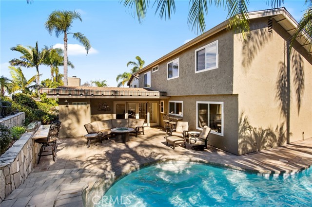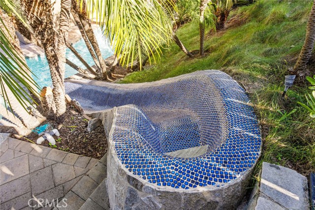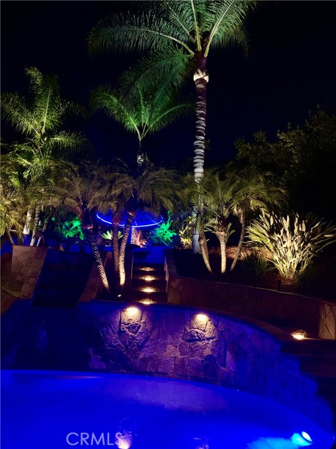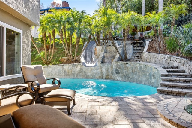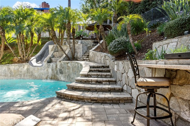 The Bar Was Raised to Top Notch Platinum! This Home is The One, Cul-de-sac Pool Home, 4 Bedrooms, 3 full bathrooms, and 1 outside poolside bathroom with outdoor shower area. Upgraded features throughout include, newer roof, European custom kitchen cabinets and granite countertops, impressive stainless range hood, family room with media room features; surround sound, black-out shades and sound proof built walls. Newer windows, HVAC, 2 water heaters; 1 designated for primary master. A separate spiral staircase entry boasts a library/office space with all built in shelves and desk. Downstairs bedroom has built in desk and queen size murphy bed. Master bedroom and bathroom is extremely spacious, which includes a 2 person tub and vanity area. Side yard has front gate, for easy access to the backyard paradise, you can feel like your on vacation daily; waterfall, slide, palapa bar seating area, firepit, bar seating with countertop, best entertaining setup around. Lush tropical landscaping with the ultimate privacy on this corner lot. You won't find any better location, comfort and privacy like this one! Pride of Ownership shines in each room of this home, approaching 50 years of the family owning, one of kind! With additional bonuses, near by you have top-rated schools, shopping, and dining, this home offers the blend of everything! Finished garage with built in cabinets, ceiling storage racks, attic storage has finished floor and drop down ladder. Home also provides a security system and cameras. Neighborhood has parks, hiking trails, basketball, tennis and pickleball courts. Must visit to truly see everything, too many items to list it is worth a tour. Come See You Won't Want to Miss!!