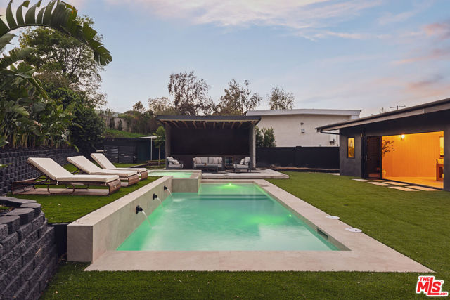 Welcome to this impeccably reimagined Mid-Century Modern residence by renowned architect Charles Du Bois, where organic modern design meets elevated contemporary living in the heart of Woodland Hills. Set on an expansive 12,000-square-foot lot, this 3,052-square-foot architectural showpiece offers five bedrooms, three bathrooms, and a seamless indoor-outdoor lifestyle curated for modern luxury. The interiors unfold through a light-filled, open-concept floor plan highlighted by soaring vaulted wood ceilings, exposed beams, curated lighting, and a striking double-sided fireplace that anchors the living spaces with warmth and sophistication. The chef's kitchen is both refined and functional, featuring stainless steel appliances, sleek marble countertops, and custom cabinetry ideal for intimate gatherings and elevated entertaining alike. The primary suite serves as a serene retreat, complete with a spa-inspired bath and two generous walk-in closets. Additional bedrooms are thoughtfully designed to offer flexibility, comfort, and style. This residence has been comprehensively updated with all major systems fully replaced, including new plumbing, electrical, roofing, and mechanical systems, offering modern efficiency and peace of mind alongside its timeless design. Outdoors, the property transforms into a private resort. Enjoy a newly constructed pool, a covered cabana with a fully equipped outdoor kitchen, and lush, manicured grounds that provide exceptional privacy and tranquilityperfect for entertaining, relaxing, or enjoying everyday California living. Ideally located moments from Calabasas' premier dining and shopping and within a highly regarded school district, this exceptional offering delivers a rare blend of architectural pedigree, modern luxury, and an enviable lifestyle.