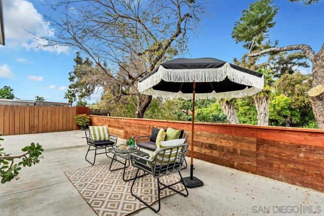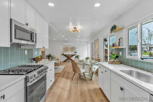 Welcome to this beautifully newly refreshed and renovated classic Southern California bungalow. Located in a prime central location in the heart of Oak Park, just minutes from the vibrant energy of North Park. Brimming with charm and curb appeal, this 3-bedroom, 2-bath residence invites you to enjoy classic front-porch living in a quiet, community-focused neighborhood. Conveniently located near Oak Park Elementary School, neighborhood parks, and within walking distance to local cafés and eateries, with easy access to the dining, shopping, and culture of North Park. This home seamlessly blends classic character with modern upgrades in one of San Diego’s most centrally positioned neighborhoods. A truly turnkey opportunity offering style, comfort, and location—this is Oak Park living at its best. The designer front entry door opens into a sun-drenched, open-concept living space featuring wide-plank luxury vinyl flooring, oversized windows, recessed lighting, and a clean, modern aesthetic throughout. Efficient mini-split HVAC units provide year-round comfort, while the new dual-pane windows throughout enhance the energy efficiency of the home. The bright white kitchen is thoughtfully designed with all-new appliances, timeless finishes, and effortless flow into the living and dining areas—ideal for both entertaining and everyday living. Both bathrooms have been tastefully reimagined with spa-inspired walk-in showers, striking vertical statement tile, custom hex-tile shower flooring, and sleek, contemporary fixtures. Step outside to a private, canyon-facing backyard surrounded by new fencing, offering serene green views and a tranquil setting perfect for relaxing or hosting guests. The extended driveway provides ample additional parking, and the epoxy-finished garage adds a polished, functional touch for flexible use.