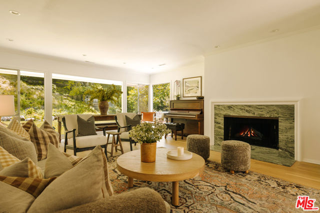 Peacefully secluded behind a citrus grove and gated drive, this impeccable newly renovated, single-story estate sits on almost 3/4 an acre of lush landscaped grounds, offering updated luxury design and effortless California living in the heart of Mandeville Canyon. A soaring skylit foyer flanked by an organic stone wall, welcomes you into the home, opening into a sophisticated formal living room with a custom marble fireplace and floor-to-ceiling windows looking out onto the expansive backyard and hillside planted with a meadow of California wildflowers. A warm and stylish adjacent family room features a stone fireplace, white washed paneled walls, a ceiling of skylights and large windows overlooking the grounds, which blur the line between indoors and out. The stunning Calacatta marble gourmet kitchen, with a seated chef's counter, opens to a bright breakfast area and is appointed with top-of-the-line Wolf and Sub-Zero appliances and Waterworks fixtures, as well as custom open shelving and a generous center island. The chic formal dining room with sculptural lighting offers lush front garden views and flows effortlessly into an intimate study/library with a third fireplace, alongside a versatile office/studio hidden behind a bookshelf door, which also has its own private entrance from the motor court.The generous primary suite overlooks the tranquil backyard and features a spa bathroom with Calacatta marble dual vanities and shower, a freestanding Waterworks tub, Waterworks fixtures, all accented by designer lighting. Two additional spacious bedrooms are situated in the this wing, sharing a beautifully appointed full bathroom with high-end finishes. The home is further complemented by an additional guest bedroom with a private bath in another wing, near to a laundry room, Waterworks powder room, and a spacious two-car garage. The property has several outdoor living spaces including a large patio, a landing under a towering live oak tree and redwoods which can be used for dining or as an outdoor lounge area, as well as paths along the hill leading to another private spot for mediation or morning coffee. The large flat yard in front of the hillside has plenty of room should you want to expand or add a pool. Renovated in 2024, additional upgrades include a comprehensive lighting redesign and update, custom motorized shades throughout, new interior and exterior paint, new and refinished wood floors, and a fully integrated top of the line audio system, just to name a few thoughtful details that bring to this classic Mandeville property to meet today's luxury standards. Renowned for its calm atmosphere and exclusivity, Mandeville Canyon draws those who desire privacy without compromising city conveniences. Just moments from the Brentwood Country Mart, fabulous dining, and top-rated schools,2610 Mandeville Canyon presents a truly rare opportunity to indulge in the pinnacle of Westside living. A must-see.