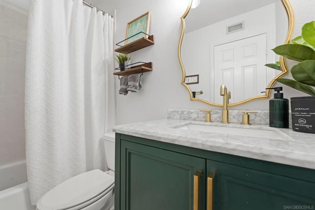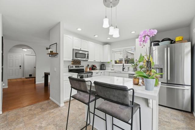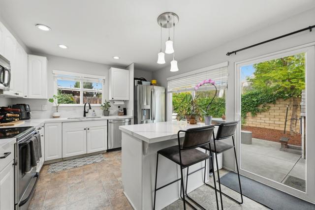 Enjoy the ideal blend of comfort, style, and location in this charming single-level Poway home tucked away on a quiet cul-de-sac within the highly sought-after Poway Unified School District. Designed for easy living and entertaining, this 4-bedroom residence features a spacious backyard, prestigious local schools, and a beautifully light-filled interior. Inside, you’ll find hardwood flooring, recessed LED lighting, a cozy fireplace, and an abundance of natural light that welcomes you the moment you step into the family room. The dining area opens seamlessly to the backyard through sliding glass doors, creating an effortless indoor-outdoor flow. The updated kitchen showcases Calacatta quartz countertops, stainless steel appliances and sink, white custom cabinetry, a center island, and a breakfast nook with additional built-in storage. Outside features a private backyard retreat, complete with a generous grassy area, low-maintenance landscaping, and a concrete patio ideal for summer barbecues and gatherings. Down the hall, a newly upgraded full bathroom is thoughtfully positioned to serve both guests and secondary bedrooms. The spacious primary suite offers a walk-in closet and its own en-suite bathroom for added comfort and privacy. Additional highlights include a newer A/C, furnace, paid off solar, and water heater. Ideally located near Old Poway Park, the Farmers Market, shopping, dining, and more—this home truly captures the Poway lifestyle.