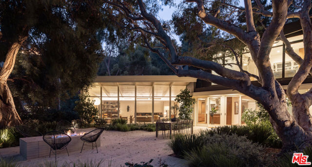 The Veneklasen House, originally completed in 1951, is a rare architectural offering in Mandeville Canyon. Designed by architect Kenneth Lind with significant influence from Modernist master Pierre Koenig, the home represents an important piece of Los Angeles design history. Koenig's impact is most evident in the dramatic living room, where an accordion-fold glass wall and sculptural brickwork create a seamless connection between architecture and landscape.The privately-gated residence spans approximately 3,904 square feet and includes three bedrooms, three bathrooms, and one powder room on a generous lot of approximately 28,314 square feet. A thoughtfully designed second-level addition introduced a light-filled primary suite positioned to take full advantage of the canyon setting, offering an elevated and private retreat immersed in nature.A classic post-and-beam structure with expansive glass walls defines the home's open yet intentional layout. Indoor and outdoor spaces flow effortlessly to landscaped gardens by Mark Tessier, courtyard areas, and canyon views. The V-shaped layout of the estate centers around a remarkable, sculptural mature eucalyptus tree supported by manicured, low-lying native plantings, reinforcing seclusion, artful balance, and a deep sense of place. Interiors are refined yet comfortable, featuring a cohesive palette of dark walnut, stone, layered textiles, and playful touches of celadon quartzite. Open, light-filled spaces are thoughtfully divided into distinct zones, each with its own atmosphere. Nearly all furnishings are vintage, lending warmth, authenticity, and a collected aesthetic that complements the architecture without distraction.Private, immersive, and architecturally significant, receiving the 2022 AIA LA Award for Historic Preservation, this is a rare Mandeville Canyon offering that balances pedigree, comfort, and legacy.