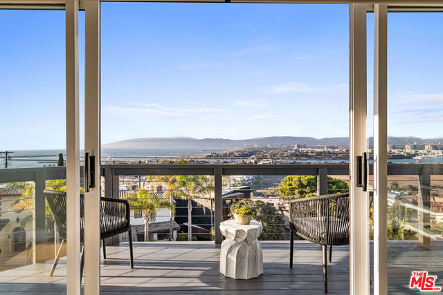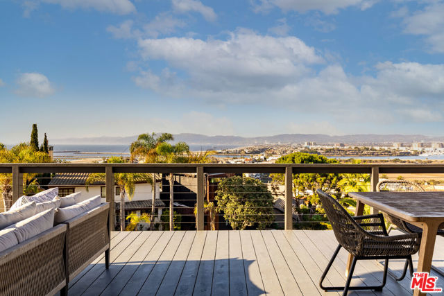 Nestled atop the coveted Playa del Rey Bluffs, this exceptional five-bedroom, five-bathroom residence offers an extraordinary coastal lifestyle with sweeping, unobstructed views. Ideally located just minutes from LAX, Playa Vista, Culver City, and Santa Monica, the home showcases some of the most dramatic vistas in Los Angeles, capturing the marina, city skyline, and water with breathtaking 180-degree panoramas. Upon entry, an expansive open floor plan immediately draws you in, designed to frame the views from nearly every angle. Rich hardwood floors run throughout, while the main living level is thoughtfully dedicated to entertaining, featuring a warm fireplace and oversized sliding bay windows that open to a spacious outdoor deck perfect for taking in the ocean breeze and unforgettable sunsets. The chef's kitchen serves as the heart of the home, anchored by a large stone-topped island ideal for both daily living and hosting. Outfitted with premium stainless steel appliances, including a commercial-grade gas range and oven, built-in microwave, and dishwasher, the kitchen is both functional and refined. An adjacent den or breakfast nook adds flexibility for casual dining or work-from-home needs. The upper level is reserved for the primary suite, a true private retreat with commanding marina and city views. Vaulted ceilings with exposed wood beams create a sense of volume and warmth, while the oversized walk-in closet offers custom built-ins for exceptional storage. The spa-inspired primary bath features dual modern vanities, a freestanding soaking tub, and a separate walk-in shower wrapped in floor-to-ceiling stone. On the lower level, a fully equipped in-law accessory dwelling unit provides outstanding versatility. Complete with its own kitchen, fireplace, and private balcony, this space is ideal for guests, extended family, or additional living flexibility. The bedroom on this level also features a fireplace and opens to a private patio, enhancing its retreat-like feel. Additional highlights include a two-car garage and ample street parking for guests. Public records reflect approximately 4,153 square feet; the property has been independently measured at approximately 5,300 square feet. Buyer to verify all square footage and permitted status to their satisfaction. This is a rare opportunity to experience elevated coastal living in one of Playa del Rey's most sought-after locations an entertainer's dream and a serene sanctuary by the sea.