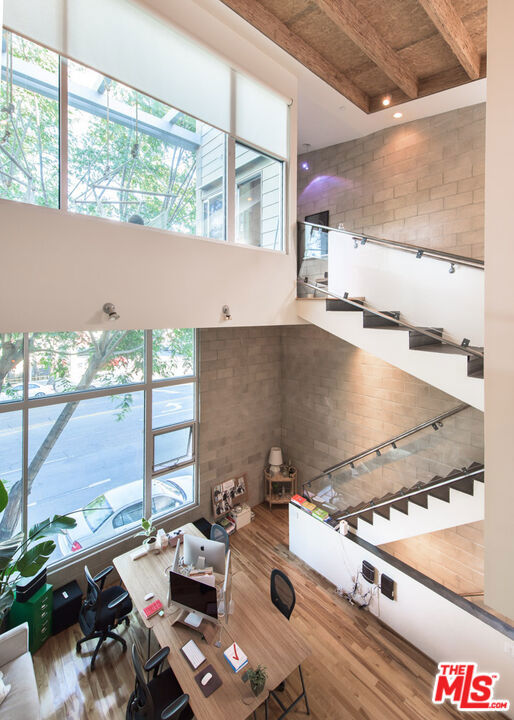 Step into a truly special live/work loft that blends modern design with incredible flexibility, all permitted under desirable C2 zoning (with potential tax benefits). This beautifully designed three-level space offers an open, airy layout and approximately 2,000 square feet of usable space, including the garage. With soaring ceilings reaching nearly 24 feet, the loft is filled with natural light and a wonderful sense of volume. Facing Highland Ave, this exclusive unit showcases maple hardwood floors, exposed block walls, and oversized double-insulated windows that bring in light and views. Vaulted ceilings with open beam construction and striking steel staircases add to the contemporary, industrial character. Enjoy the convenience of separate heating and air conditioning systems, plus a private exterior deck perfect for a break or fresh air. The kitchen and bathroom are fully equipped with newer, high-quality appliances and stylish fixtures, making the space move-in ready. A two-car garage with 11-foot ceilings offers excellent flexibility for parking, storage, or workspace. The gated building provides peace of mind, and each unit is fully wired to meet today's security and communication needs.