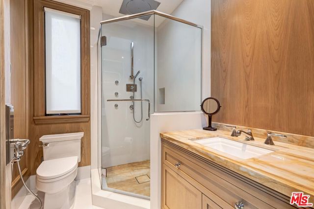 This remarkably tasteful custom 2019-built 3-level Traditional on a world-renowned road is available for sale for the first time. Featuring super high ceilings, incredible materials, exquisite stone and herringbone wood floors, detailed mouldings, wainscoting, built-ins, and smart-home technology. Grand and gracious 2sty entry with inlaid marble floors, clerestory windows, and a sweeping staircase flows perfectly to the gallery hall, stunning library/living, dining, and family rooms. Beautiful elevator and secondary staircases to all floors. Phenomenal main and prep kitchens with top stainless appliances. Kitchen opens to major dining and family rooms which lead to a wide covered/heated patio and resort-style private grounds with patios, pool, spa, fountain, pergola, outdoor shower, and pool house (guest unit) with bath. 4 (or 5) bedroom suites upstairs displaying bathrooms as "works-of-art". Substantial primary retreat with large office (possible 5th upstairs bedroom), 2 walk-ins, 2 luxe baths, fireplace, and an amazing nearly 60ft wide rear balcony with treetop views. Enormous secluded main floor bedroom suite could readily be a 2nd primary. Lower level features natural light, 2 big bedroom suites, a comfortable central entertaining space, wine cellar, and direct access to an enormous 5 car subterranean garage (nearly 1,300SF) and large storage room. Two separate laundry spaces (2nd floor and lower level) for convenience. Sited just moments from internationally acclaimed shopping, dining, hotels, medical services, and entertainment, the epitome of a luxurious lifestyle resides here. Shown only to highly pre-qualified buyers.