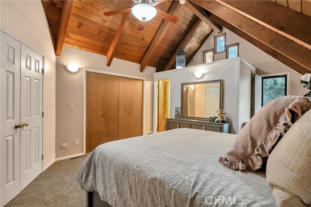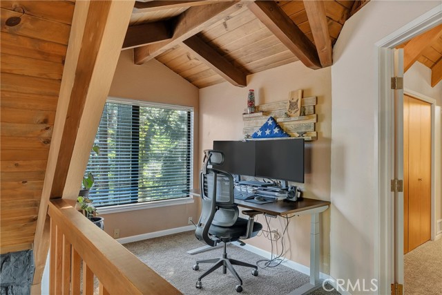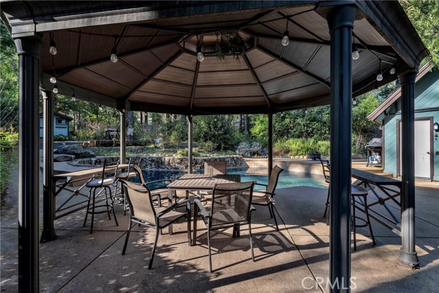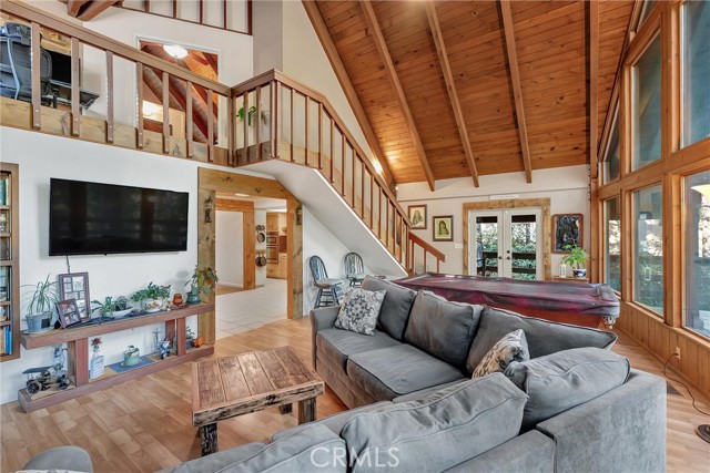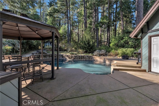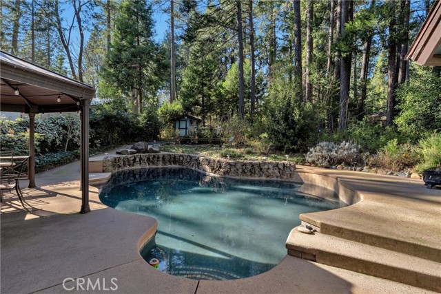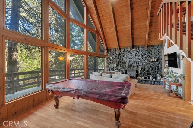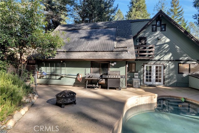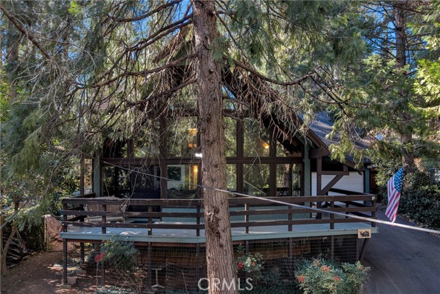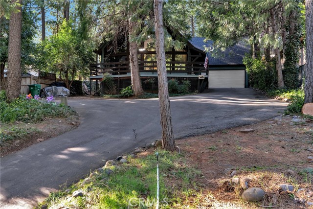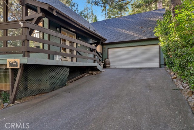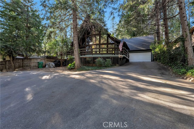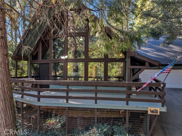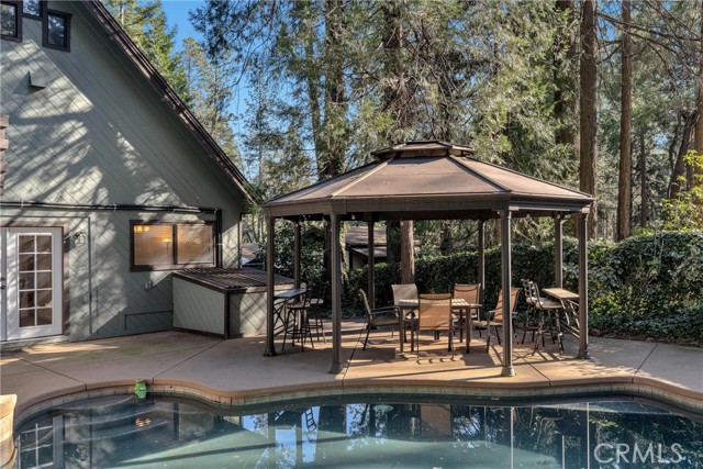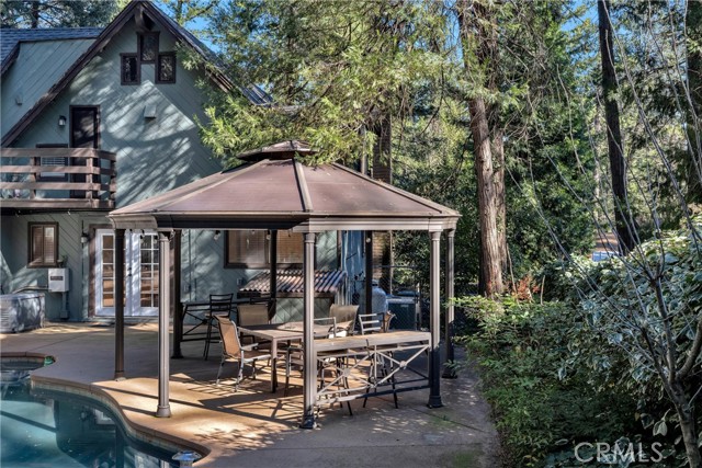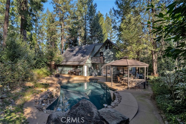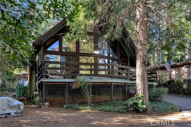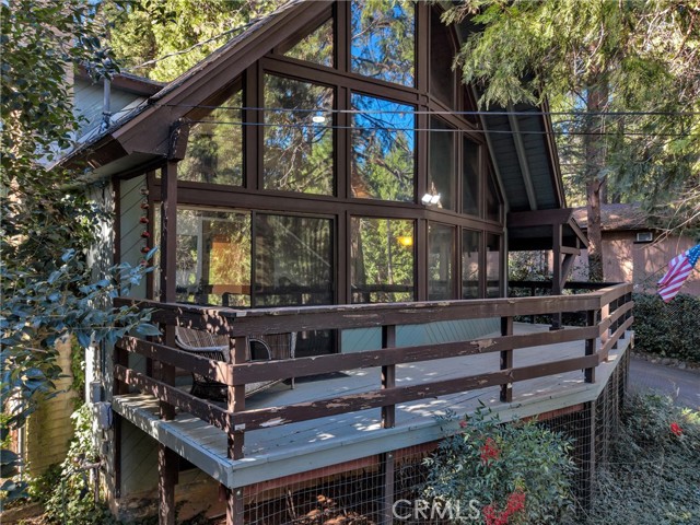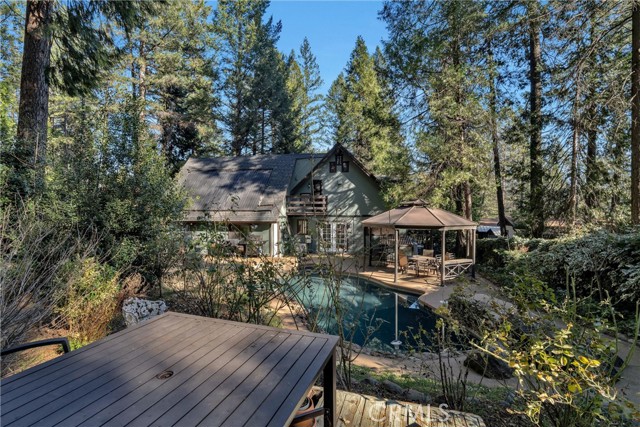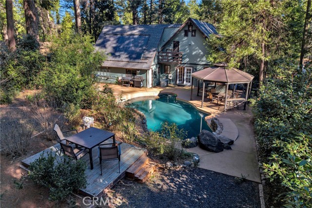 A-frame home offering a perfect blend of architectural charm and resort-like living. This 2-bedroom, 2.5-bath home features a large great room with vaulted ceilings, floor-to-ceiling windows, and a rock-accented wood stove that fills the space with natural light and warmth. Sliding doors lead to a spacious front deck ideal for entertaining or relaxing among the trees. The upstairs primary suite is a private retreat with vaulted ceilings, a balcony overlooking the backyard and pool, a walk-in shower, and a loft area that looks over the great room below. The tiled kitchen includes stainless steel appliances, gas range, built-in oven and microwave, dining area, and access to the laundry room and attached two-car garage. Additional features include ceiling fans throughout and a whole-house generator. Step outside to a beautifully landscaped backyard oasis featuring an in-ground solar-heated gunite pool, sun deck, gazebo, patio, walking paths, rose garden, mature trees, and storage shed. Located outside the POA, offering added flexibility. A rare opportunity to enjoy mountain living with exceptional indoor and outdoor spaces.