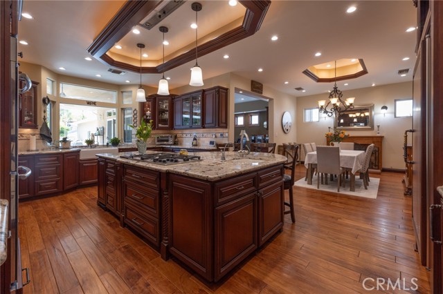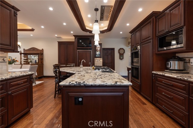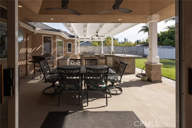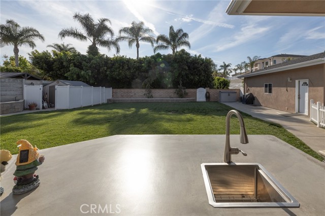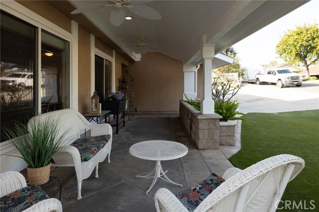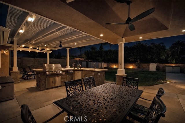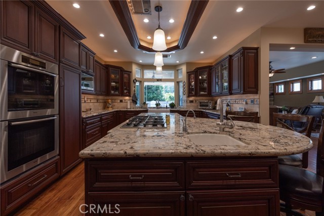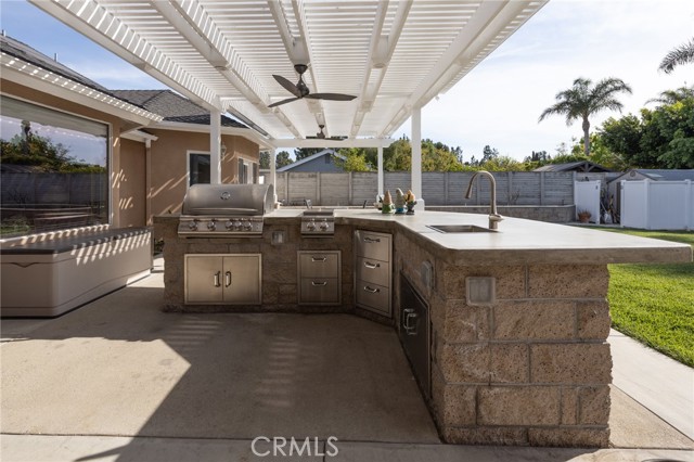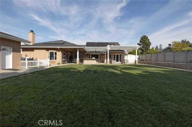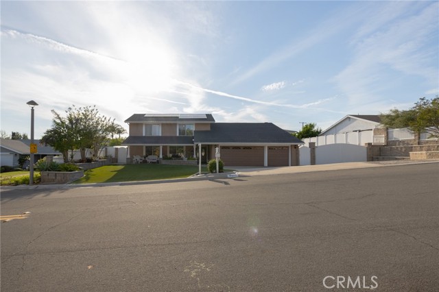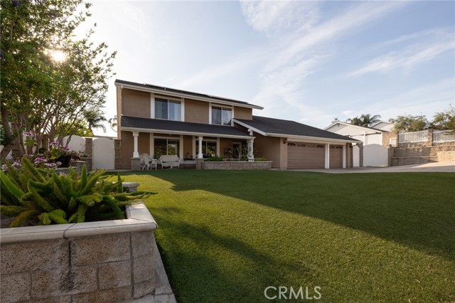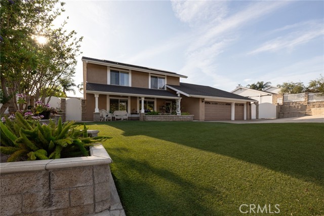 Multigenerational living in Yorba Linda! The main house lives like a single level with the primary ensuite & two bedrooms/one bath on the first floor and two beds/one bath upstairs. The detached ADU offers potential for income, and the RV driveway offers separate access as well as electricity and a dump station. This 5 bed, 3 bath home with a 2 bed 1 bath ADU and RV parking on an oversized lot with solar panels offers room for the whole family. For those warm Summer nights, the extended roof patio spans the front of the home in rain or shine, and your front lawn will always look mowed with the manicured artificial turf. The RV gate is 17 ft wide and the driveway is over 60ft long and 18ft wide from eves to wall along side the 3 car garage. Inside, views to the backyard, vaulted ceilings, and a warm wood floor greet you. The classic kitchen is beautifully appointed with top-of-the-line appliances including a Sub Zero refrigerator, Dacor 5 burner stove, Miele double ovens and warming drawer, Kitchenaide stainless dishwasher and fridge with panel doors matching the cherry cabinets with beading. A Farmhouse sink and solid maple pullout drawers including a spice rack, and two lazy Susans with many soft close drawers make this kitchen as functional as it is beautiful. The spacious island showcases Splendor granite, a vegetable sink and seating for three. The ample cabinetry also offers a coffee cabinet and Splendor backsplash diamond cut outs. An abundance of lighting tops it off. The dining area accommodates a 12 ft table and warm fireplace. Come hang out in the very spacious and warm great room with stone covered fireplace and raised hearth. Windows and glass doors to bring in lots of light and a built in desk with cabinets span one whole wall. Step out to the patio where you'll find an outdoor kitchen with concrete counters, a Blaze BBQ, 2 burner stove, sink and garbage disposal. Green grass, avocado trees, and the ADU are surrounded by Slump Stone and Concrete walls. The 920 foot ADU hosts 2 bedrooms and 1 bath with kitchen overlooking a very spacious gathering area, lots of cabinetry and its own laundry and an outside gated artificial turf yard. Step back into the primary bedroom doors from the patio in the main house to find a spacious primary bedroom with a wall of closets, walk in shower in the primary bath and 2 more first level bedrooms and the hall bath hosts the tub. Upstairs -two large bedrooms and a full bath. Shopping, theatre and great schools!