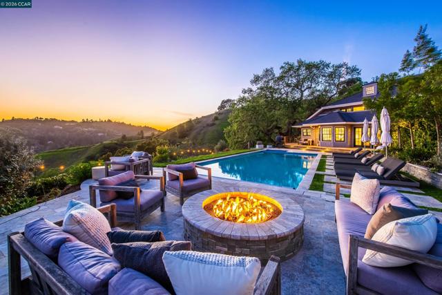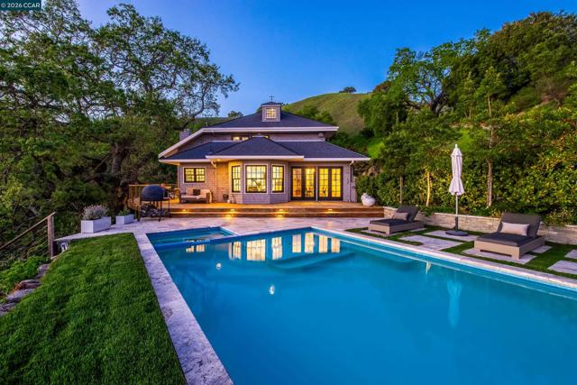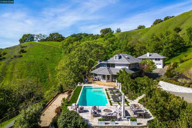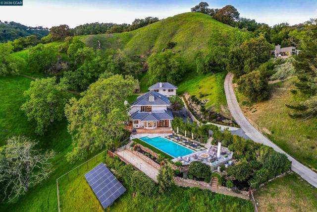 Open Saturday and Sunday 2-4! It’s a Lifestyle… offering privacy, breathtaking views, and direct access to Briones Regional Park with 6,200+ acres of trails for hiking, biking, and horseback riding, all in a prime Happy Valley location. Designed for effortless everyday living, entertaining, and relaxation, this home captures the essence of indoor-outdoor California living. The chef’s kitchen features top-of-the-line appliances, a wet bar, bar seating, and a sun drenched dining nook, complemented by a formal dining room, expansive living room, and private office, all with stunning views. The luxurious primary retreat on the main level offers a spa-inspired bath, dual walk-in closets, and direct outdoor access. Upstairs, four bedrooms, two baths, a versatile flex space, balcony, and bonus room provide flexible living options. The resort-like grounds include multiple patios for entertaining, a large deck framed by majestic oaks, a pool and spa with cover, fire pit, bocce court, a chicken coop, private trail into Briones, and enchanting gardens. Additional highlights include a detached three-car garage and a one-bedroom guest house. Ideally located just minutes from downtown Lafayette, BART, Highway 24, scenic hiking trails, and top-rated Lafayette schools.