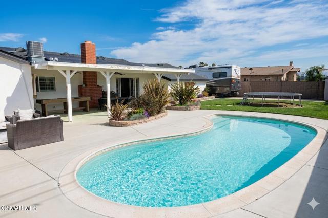 Pictures will be up by Friday March 20, 2026 . First showing: March 22, 1:00PM to 4:00PM. All you need to do is pack and move in! This nicely done 4-bedroom, 2-bathroom home in Newbury Park offers a clean, modern aesthetic and a highly functional open floor plan. The heart of the home is a tastefully renovated kitchen that flows directly into the living and dining areas, creating a welcoming space for daily life. This home is conveniently located just minutes from local shopping centers and sits within a distinguished school district, making it as practical as it is charming.The entertainment-ready backyard is a true private oasis designed for making memories. Imagine spending your weekends lounging by the sparkling pool or hosting a BBQ for friends and family seating under the fanned covered patio. All while taking in the serene, unobstructed mountain views. For those who love the outdoors, you are just a short distance from world-class hiking trails, offering endless adventures right in your backyard.Situated on a large cul-de-sac lot, the property provides plenty of privacy and room for all your toys with rare, sought-after RV access and a 2-car attached garage. Major technical upgrades have already been handled for you, including a new roof (2020), a new water heater, updated bathrooms, and a solar system for energy efficiency. If you are looking for a well-maintained, updated home in a prime location with a backyard built for fun, this is the one!