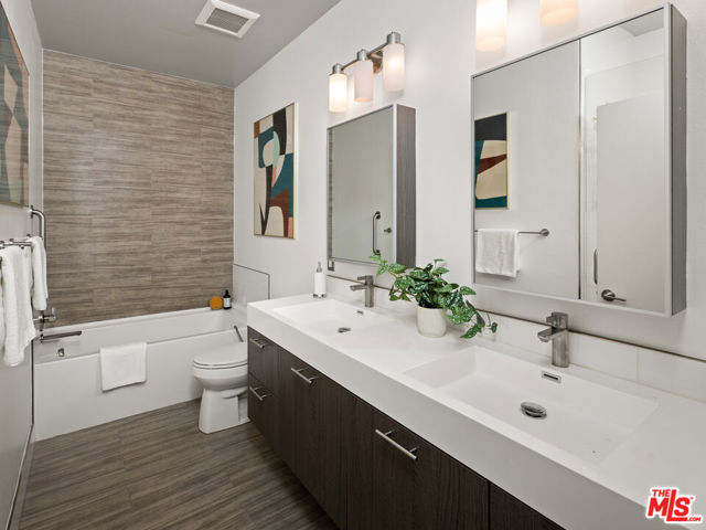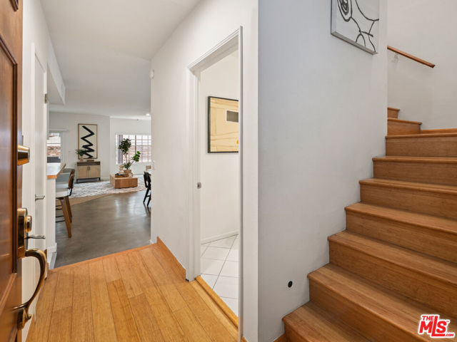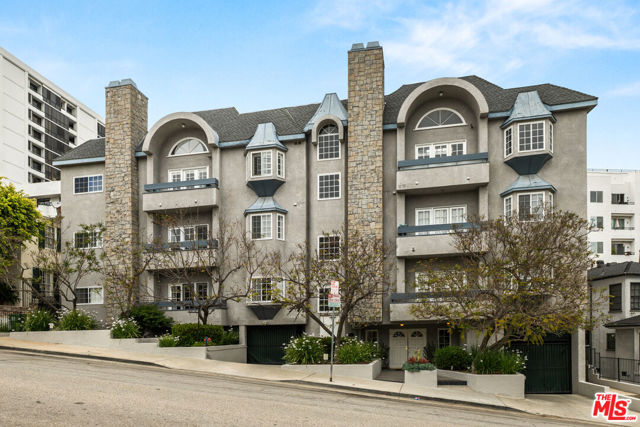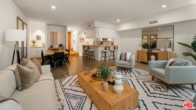 Super chic contemporary finished 2 bed/2.5 bath townhouse style condo in smaller 14-unit French Chateau Style Condo Complex on desired Ashton Blvd. , just South of Wilshire! Open floor plan that includes entry with engineered hardwood flooring, closet and powder room opening to spacious living room with contemporary concrete floors sliding door to covered balcony, dining room with wet bar and open kitchen with wrap-around breakfast bar, quartz countertops, stainless steel appliances including gas range/oven and built-in microwave, pantry cabinet with pull out drawers. Full laundry room with lots of room for storage and built-in shelving. Upstairs includes 2 bedrooms/2 bathrooms including oversized spacious primary suite with large walk-in closet and sliding door to balcony. Totally remodeled primary bathroom with tile and quartz finishes including separate bath and shower, floating contemporary cabinet with 2 sinks. 2nd bedroom is filled with natural light and large closet with updated full bathroom in hallway. Pets ok, 2 secured tandem parking, guest parking and extra storage. Ideal proximity to UCLA and Westwood Village retail and restaurants, Westfield Century City Mall, 405 and 10 Fwy access and Beverly Hills. Fairburn Elementary School. Move-in ready!
