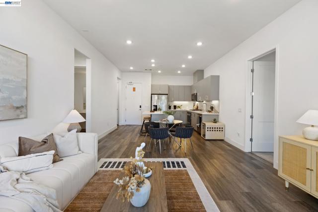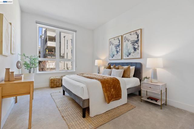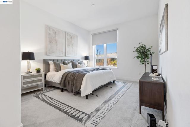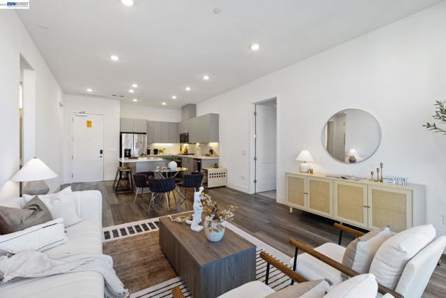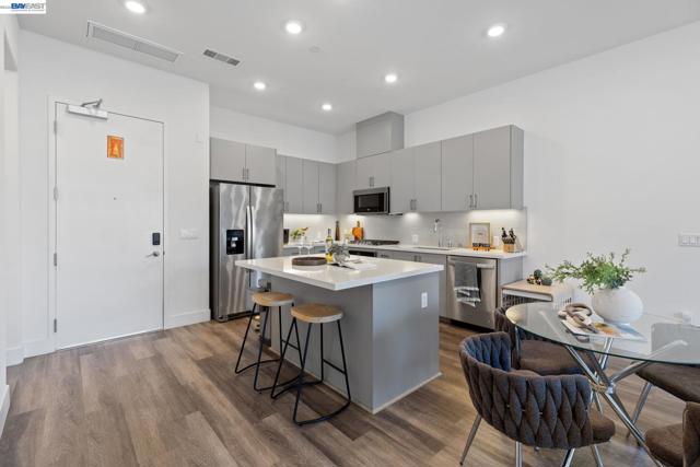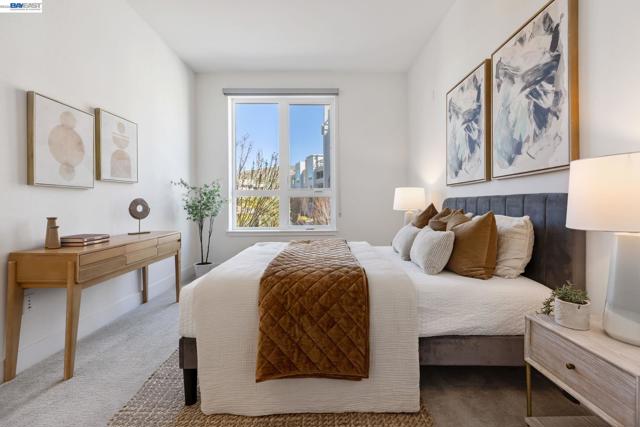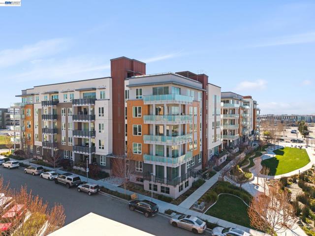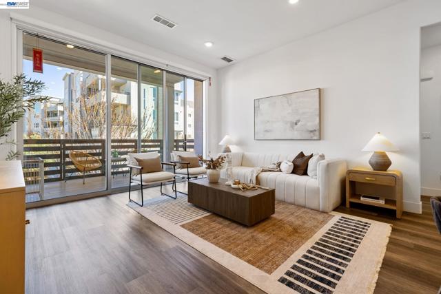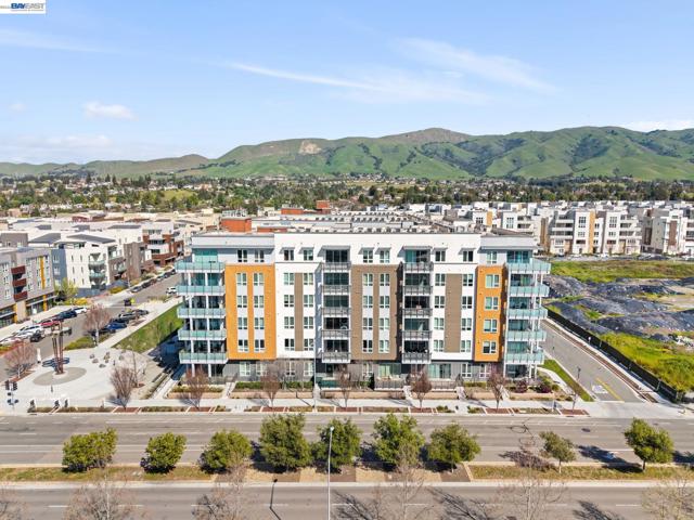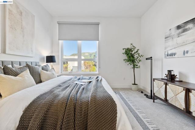 Welcome to resort-style luxury living at Metro Crossing, ideally located across from the BART station in Fremont. This move-in-ready, approximately 1,300 sq. ft. two-bedroom, two-bath condo offers modern elegance and thoughtful upgrades throughout. The gourmet kitchen features a large center island, stainless steel appliances, a glass tile backsplash, quartz countertops, and opens seamlessly to the spacious great room—perfect for both everyday living and entertaining. Expansive multi-slide glass doors lead to a covered patio, creating a true indoor-outdoor experience with stunning views of Mission Peak and the community pool. Both bedrooms include walk-in closets, and the primary suite offers a spa-inspired bath with dual sinks and a sleek glass-enclosed shower.