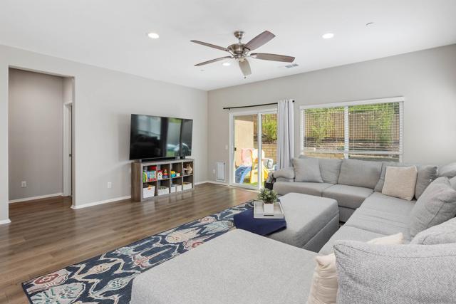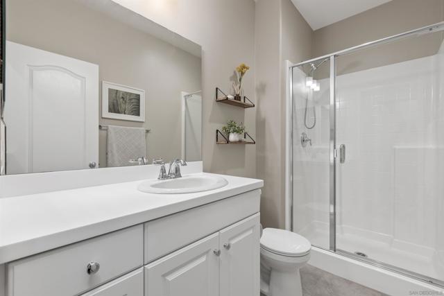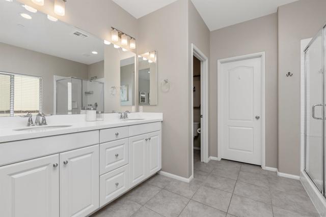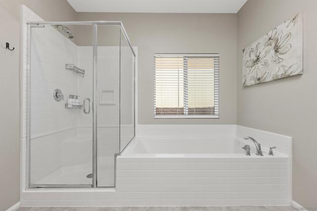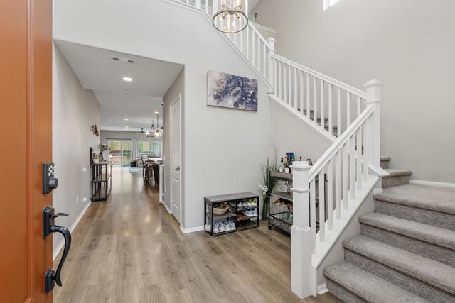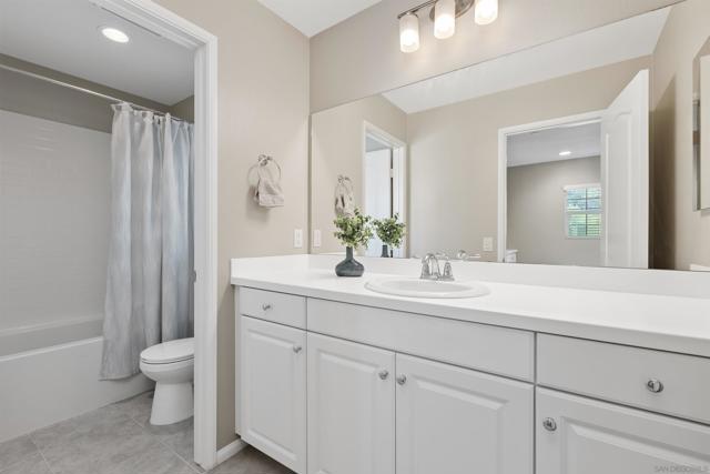 Paid Solar home nestled among the scenic rolling hills of Fallbrook, this stunning home is located in the highly desirable Horse Creek Ridge community. Thoughtfully designed for comfort and convenience, the residence features 3 bedrooms, 3 bathrooms, including a sought after downstairs primary suite with a private bath, as well as an additional downstairs bedroom perfect for guests or multigenerational living. The interior showcases elegant vinyl plank flooring and carpet, white cabinetry throughout and a beautifully coordinated granite countertop in the kitchen, creating a bright and timeless aesthetic. The spacious primary suite serves as a private retreat, complete with a large walk-in closet, a relaxing soaking tub, and a separate walk-in shower. Residents enjoy resort style community amenities, including multiple parks, scenic walking trails, nearby hiking opportunities, and access to local golf courses. The community also offers a basketball court, BBQ grills, club house, two sparkling swimming pools, all providing the perfect setting for relaxation and recreation.