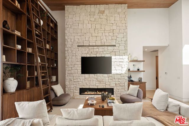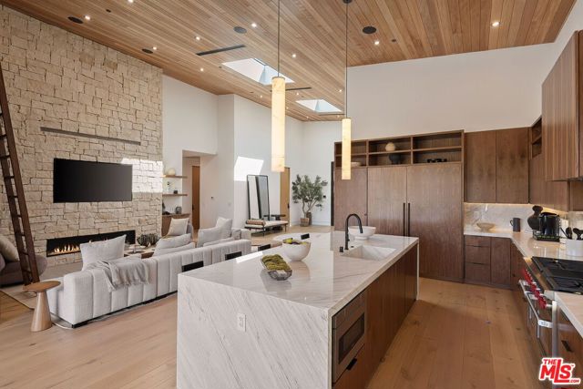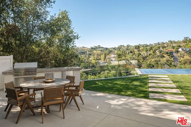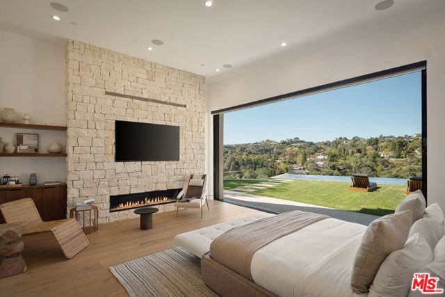 Privately gated on a quiet cul-de-sac, this newly completed modern residence captures sweeping jetliner canyon views. Designed for both privacy and impact, the home features soaring 18-foot mahogany-clad ceilings, multiple skylights, a dramatic 16-foot library, and expansive sliding glass walls that create seamless indooroutdoor living. The striking black-tiled pool, supported by five structural caissons, includes a sleek Baja shelf for private lounging against the panoramic backdrop. Interior finishes are of the highest quality and pair warmth with sophistication, including white oak floors, custom walnut cabinetry, Calacatta Cremo kitchen countertops, marble vanities Calacatta Picasso marble, Roman clay walls and more. The primary suite offers a tranquil sitting area, a spacious custom walk-in closet, and a spa-inspired bath with a soaking tub positioned to frame the canyon views. Outdoor entertaining is effortless with a fully equipped kitchen featuring a sink, BBQ, refrigerator, and a built-in fire pit lounge. Thoughtfully designed with exceptional craftsmanship and refined materials, this residence delivers a striking expression of modern luxury in one of Los Angeles' most desirable hillside settings.