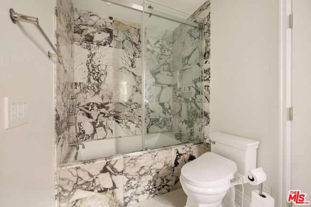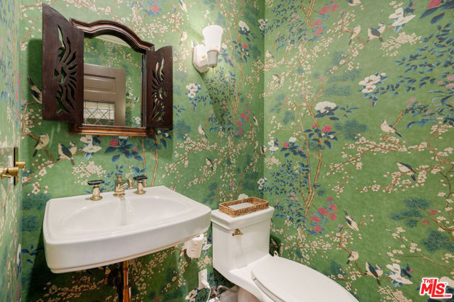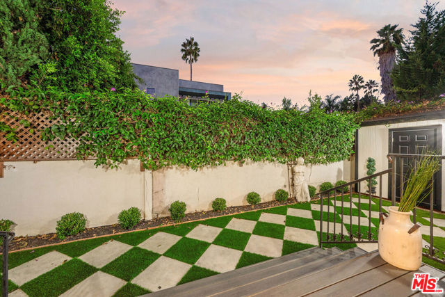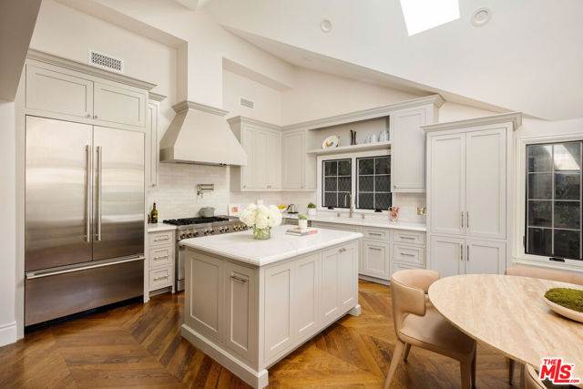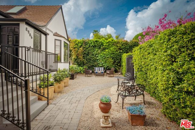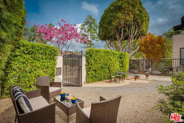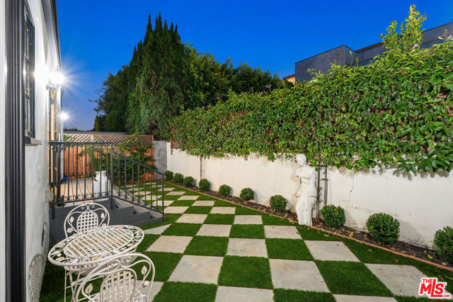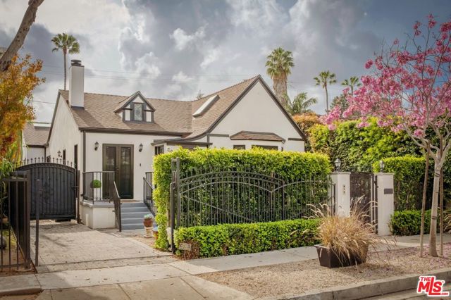 Rebuilt in 2023 and thoughtfully reimagined, this rare single-level four-bedroom residence embodies timeless elegance with soaring 15-foot ceilings, abundant natural light, and a seamless blend of classic craftsmanship and modern sophistication. Every detail has been meticulously curated with exceptional finishes and refined design throughout. A luminous open floor plan welcomes you with chevron white oak hardwood flooring, multiple skylights, custom millwork, and Forbes & Lomax designer light switches. At the heart of the home, the chef's kitchen impresses with dramatic 15-foot ceilings, Jenn-Air professional-grade appliances, dual appliance garages, a pot filler, and an oversized island ideal for entertaining. The living room is rich with character, showcasing original 1920s stained glass, a marble fireplace mantel imported from Europe, and built-in library shelving extending to the ceiling. The serene primary suite features vaulted ceilings, dual skylights, a gas fireplace, French doors with a Phantom screen system, and a custom walk-in closet. The spa-inspired primary bath is appointed with Bardiglio and Carrara marble floors, a clawfoot soaking tub, oversized shower, and an antique door with a diamond-leaded glass window. Three additional bedrooms offer generous storage and bespoke details, complemented by beautifully designed bathrooms featuring Calacatta Viola marble and Phylrich fixtures. Outside, a private garden retreat awaits with new hardscape and landscape, diamond-pattern pavers, a motorized driveway gate, and mature privacy hedging. Additional amenities include DoorBird entry, EV charging, built-in speakers throughout, and a custom powered shed. Perfectly positioned mid-block on one of West Hollywood West's most coveted streets, this exceptional home offers an unparalleled lifestyle just moments from the city's finest dining, shopping, and entertainment.