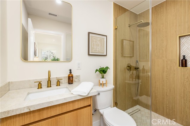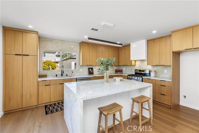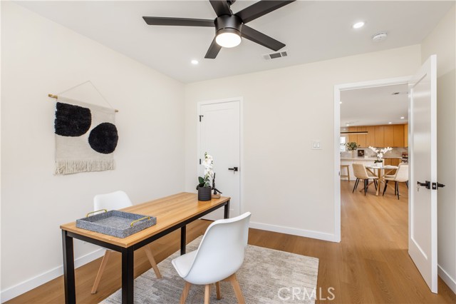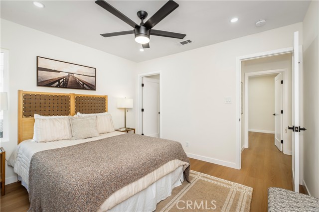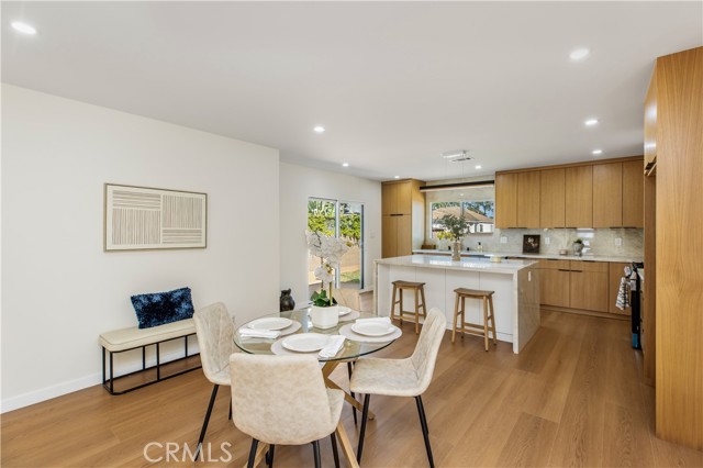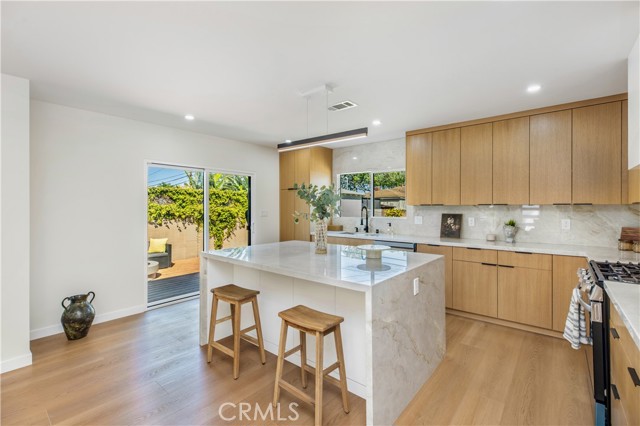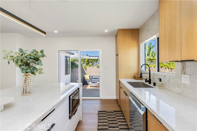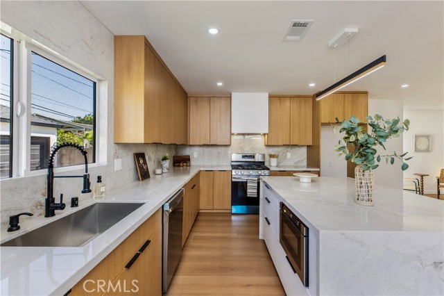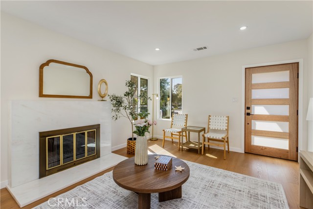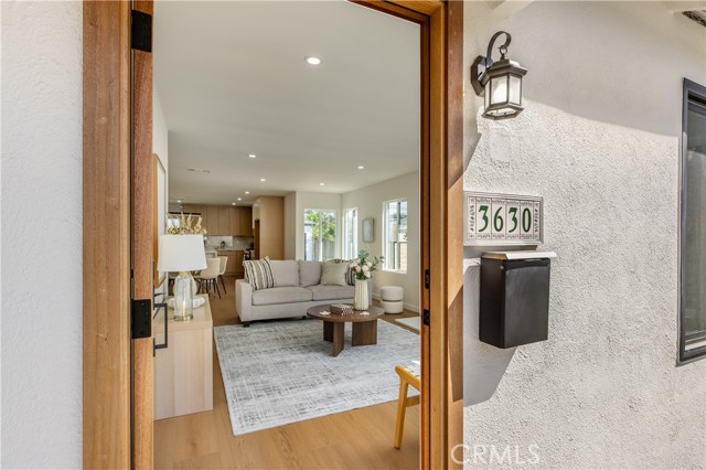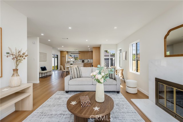 This beautifully updated, chic home offers the perfect balance of historic charm and modern amenities. The property has been thoughtfully remodeled with quality materials and modern upgrades throughout. Upon arrival, you are welcomed by a grassy front yard and a solid mahogany front entry door, setting the tone for the craftsmanship found inside. The home features a spacious open-concept layout with 3 bedrooms and 2 full bathrooms, including a primary suite with a private en-suite bath. Inside, the home showcases luxury oak flooring, new insulation, new drywall, new interior doors, fresh interior and exterior paint, and new LED lighting installed throughout the home. These upgrades were thoughtfully completed with energy efficiency in mind. The vibrant open living space is anchored by a stunning quartz slab fireplace, creating a warm focal point that seamlessly flows into the formal dining area. The modernized kitchen is designed for both functionality and style, featuring: Taj Mahal natural stone countertops and island — a beautiful and durable natural stone. Soft-closing white oak cabinetry with oversized pantry-style storage Large barn-style sink Down bar seating for casual dining Stainless steel appliances, including an LG dishwasher, Cosmo built-in microwave, and 4-burner stove with oven Both bathrooms feature white oak cabinetry, Taj Mahal countertops, and waterproof accented tile finishes, combining durability with elegant design. Wireless ceiling fans with integrated LED lighting in the bedrooms The new dual-pane windows are farmhouse-style black retrofitted vinyl and doors installed throughout the property, improving both energy efficiency and architectural appeal. The backyard Trex composite waterproof deck and sitting area, overlooking a large grass sports yard, perfect for outdoor activities, gatherings, and entertaining. a separate two-car garage, The backyard entrance is secured with a custom oak and steel gate, providing privacy, security, and an elegant architectural touch to the property. Additional major upgrades include: NEW Roof just installed, New 4-ton A/C- HVAC system with heat pump. New 200-amp electrical service, New Tankless water heater. Even more allCopper plumbing exist. This home offers modern living with peace of mind, where major systems and finishes have been upgraded for comfort, efficiency, and long-term durability. Your children can walk to nearby schools, perfect to raise a family. Close to 10-fwy, 405-fwy & 110-fwy.