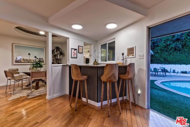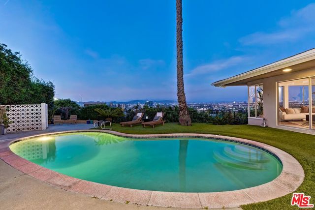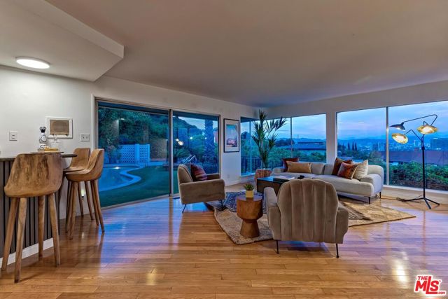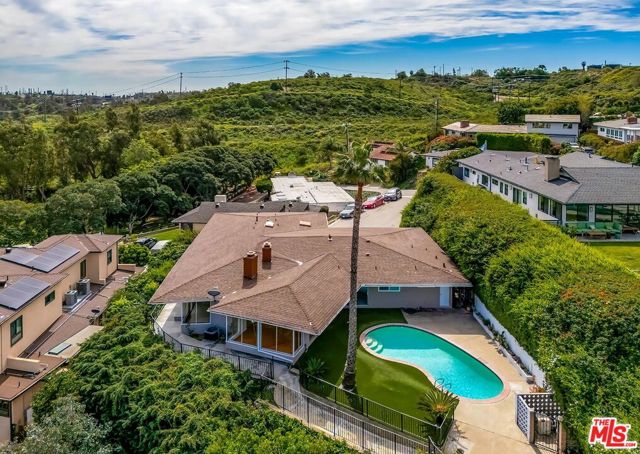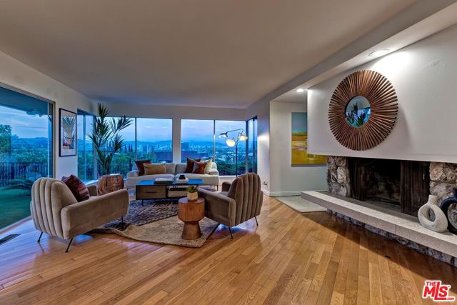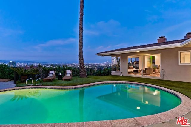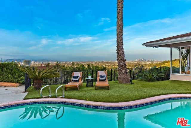 Incredible Mid-Century Modern retreat in the coveted Culver City Hills showcasing sweeping jetliner views across Los Angeles. Built in 1961, this architectural gem captures the essence of classic California living with iconic design elements including a statement cocktail bar, dramatic oversized stone fireplaces, and walls of floor-to-ceiling glass that frame panoramic vistas stretching from the Hollywood Sign to Downtown LA. A striking solitary palm tree silhouettes the sparkling pool and lounge deck, creating a true resort-style setting. The spacious, thoughtfully designed floor plan features a private primary suite complete with a walk-in closet, dedicated vanity area, dual-sink bath, and breathtaking city views from the bedroom. Formal dining flows seamlessly into a grand living room anchored by a stunning stone fireplace and sliding glass doors that open to the pool deck for effortless indoor-outdoor living. A sunken family room wrapped in rich wood paneling offers a second stone fireplace and expansive picture windows, the perfect space to unwind while taking in golden hour over the city skyline. Tucked away on a quiet cul-de-sac in desirable Blair Hills, the home offers access to Farragut Elementary and sits just moments from Baldwin Scenic Overlook Park, scenic trails to Stoneview Nature Center, and the Kenneth Hahn bridge. A dream location for outdoor enthusiasts, yet only minutes from the shops and dining of Downtown Culver City. A rare three-car garage provides excellent potential for a home studio, gym, expanded living space, or future ADU conversion.