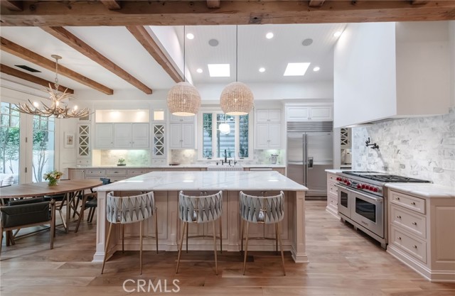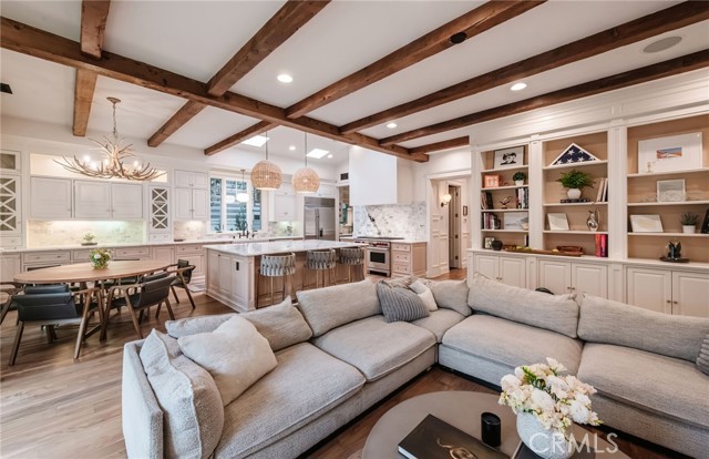 Located on a coveted block in Manhattan Beach’s Tree Section, 2100 Pine Avenue is a custom-crafted residence distinguished by warmth, architectural character, and an exceptional level of detail. Built in 2008 and meticulously maintained, the home offers five bedrooms, four-and-a-half baths, and approximately 3,180 square feet of thoughtfully designed living space. From the moment you arrive, the home conveys a sense of story and substance that is increasingly rare. Rich with bespoke detail, the interiors are defined by beamed ceilings, walnut floors, custom millwork, and beautifully layered finishes that bring depth, texture, and timeless appeal to every room. Thoughtfully designed and deeply inviting, the home balances refined craftsmanship with effortless livability. At the center of the home, the chef’s kitchen is both striking and functional, featuring an oversized Calacatta marble island, a 48-inch six-burner Wolf range with grill, abundant storage, and a butler’s pantry with wine refrigerator. Adjacent living spaces open seamlessly to a private backyard retreat complete with a built-in outdoor kitchen, fireplace, additional wine refrigerator and dedicated dining area designed for year-round entertaining. Privately situated, the primary suite offers soaring ceilings and a true sense of retreat, complemented by a custom California Closets walk-in closet that pairs beauty with exceptional function. Additional highlights include dual-zone central air conditioning, EV charging capability, and a finished garage with built-in storage.