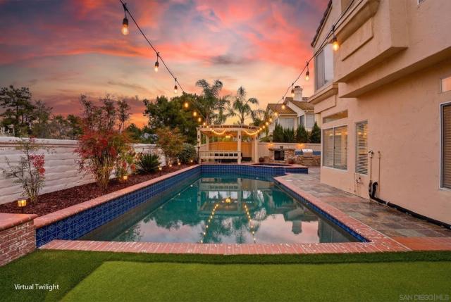 Welcome to a rare opportunity in the highly sought-after Redhawk community of Temecula. This beautifully updated 5-bedroom home (4+1 bonus, currently a dance studio), proudly owned and meticulously maintained by the original owner, is ideally located on a quiet cul-de-sac and within walking distance of top-rated schools, including the award-winning Great Oak High School. The private backyard is the true highlight of the home. With no neighbor directly behind, it offers a resort-style setting featuring a custom pool and spa, built-in outdoor fireplace, putting green, slate tile hardscape, and a raised patio cover. The built-in BBQ island with sink and refrigerator creates the perfect space for entertaining, while multiple sitting areas and custom brick planters complete this exceptional outdoor retreat. RV parking adds additional flexibility and convenience. Inside, soaring ceilings and extensive upgrades create a warm and refined atmosphere. The home features slate flooring throughout the downstairs, hardwood flooring, upgraded baseboards, crown molding, custom window casings, and ceiling fans throughout. The formal living room showcases a dramatic floor-to-ceiling natural stone feature wall, while the family room features a custom slate and stone fireplace with metal fire doors. The upgraded kitchen offers granite and slate finishes, and the bathrooms feature custom tile, granite, and upgraded fixtures. A 3-car garage and beautiful natural stone exterior accents complete this exceptional Redhawk home.